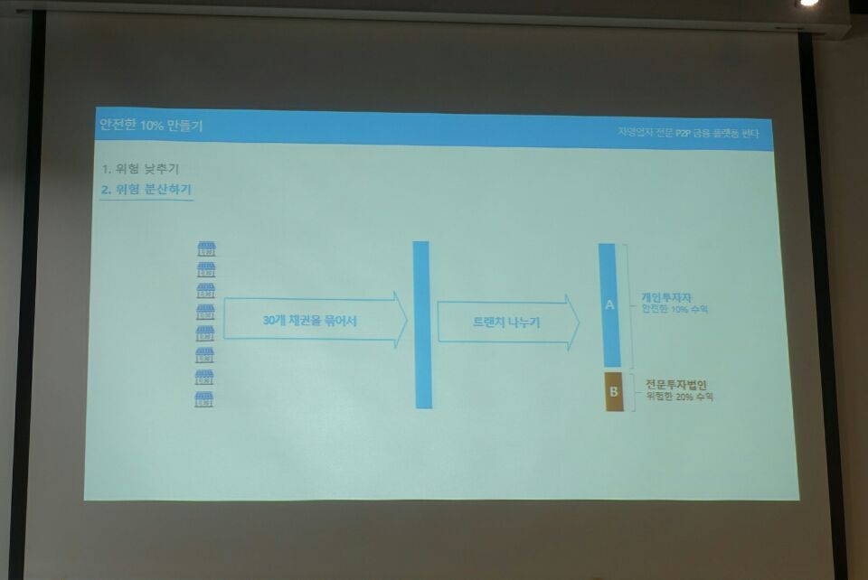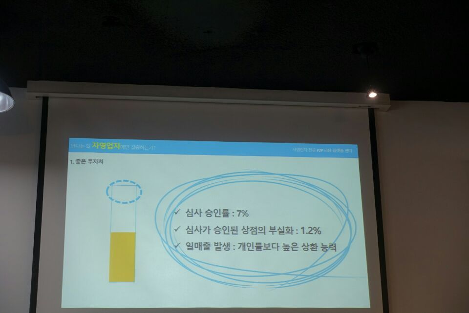 어니스트펀드와 테라펀딩은 투자해본 경험이 있는데 펀다와 팝펀딩은 업체 이름 정도만 알고 정확히 몰랐던 상황이라 이번 기회에 특별히 관심 있게 들었던 것 같습니다. 펀다의 박성준 대표께서 업체 소개를 해주셨습니다. 펀다는 자영업자에게만 전문적으로 대출을 해주고 있습니다. 리스크를 최소화하며 안전한 투자 수익 10%를 목표로 하고 있다고 합니다. (세전 10%, 세후 7.2% 목표)