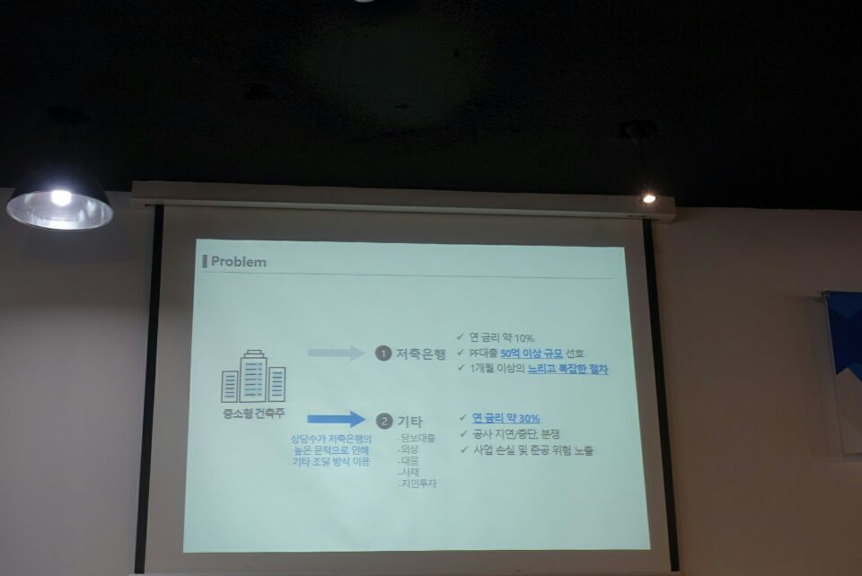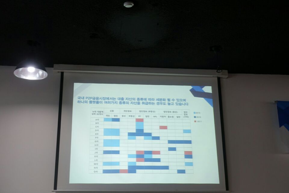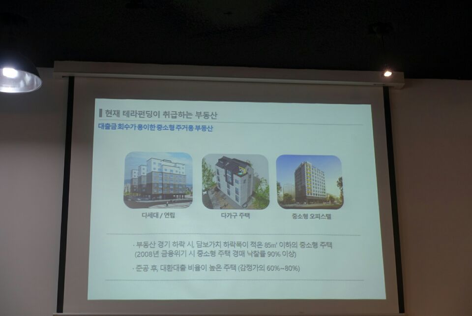 다음으로 테라펀딩 양태영 대표의 업체 소개가 있었습니다. 양태영 대표는 부동산 경매 경험이 있다고 합니다. 현재 테라펀딩은 빌라, 다세대 주택, 원룸, 오피스텔 등 소형 건설사의 주택형 부동산 투자 상품만 취급하고 있습니다. 테라펀딩의 경우 대개 건물이 완공되기 전 대출을 받는 업체들이 많은데 큰 건설사가 아닌 소형 건설사들에게는 은행들이 대출을 거의 안 해준다고 합니다. 또한 아직은 상가 등 상업용 부동산 투자 상품이 없는데 우선은 주거용 부동산 사업모델을 먼저 완성시킨 후에 상업용 부동산 투자 상품도 취급할 계획이라고 합니다. 당장은 아닐 거 같고 내년 즈음되지 않을까 싶습니다. 신용 대출 상품은 취급할 계획이 없다고 하였고 최근 선순위가 아닌 2순위 상품들을 취급하기 시작했는데 1순위보다 심사기준을 까다롭게 관리하고 있다고 합니다. 2순위 상품들은 주로 땅값 비중이 건축 비중보다 높은 상품들이 많다고 합니다.