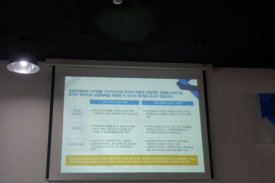 P2P업체에 대해 투자자들은 항상 내 돈으로 진짜 투자한 게 맞는지 등의 의심을 해야 한다고 조언했습니다. 그리고 상품의 안정성은 현실적으로 투자자가 판단하기는 쉽지 않기 때문에 업체의 안정성을 우선적으로 보는 것이 중요하다는 이야기를 했습니다. 업체를 수시로 귀찮게 하면서 질문에 대해 잘 응대를 해주는지 등 작은 부분을 보며 판단하라고 했습니다. 또한 한국P2P금융협회 소속의 업체들을 이용하는 것이 리스크를 줄일 수 있다고 말했습니다. 한국P2P금융협회가 공신력이 높은 단체는 아니지만 연 1회 감사를 받는 등 정부의 관리 하에 있다고 합니다. 한국P2P금융협회 외에 한국크라우드펀딩협회도 있는데 이 둘이 무엇이 차이가 있는지는 궁금하네요. 어니스트펀드가 두 협회 모두 가입된 것으로 아는데 나중에 문의해 보아야겠습니다. 아무튼 요지는 업체 선별을 잘해야 할 것 같습니다.