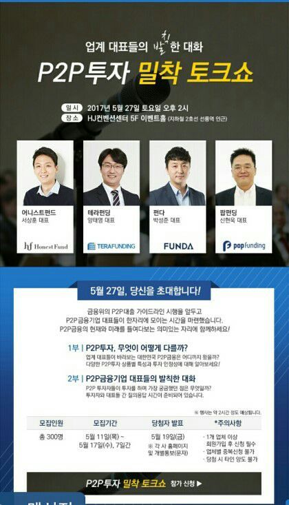 5월 27일 P2P투자 밀착 토크쇼에 초청받아 다녀왔습니다. 어니스트펀드, 테라펀딩, 펀다, 팝펀딩 대표들이 직접 자사의 P2P투자 상품의 특징을 소개하고 P2P투자에 대한 전반적인 이야기를 전달하는 시간이었습니다.