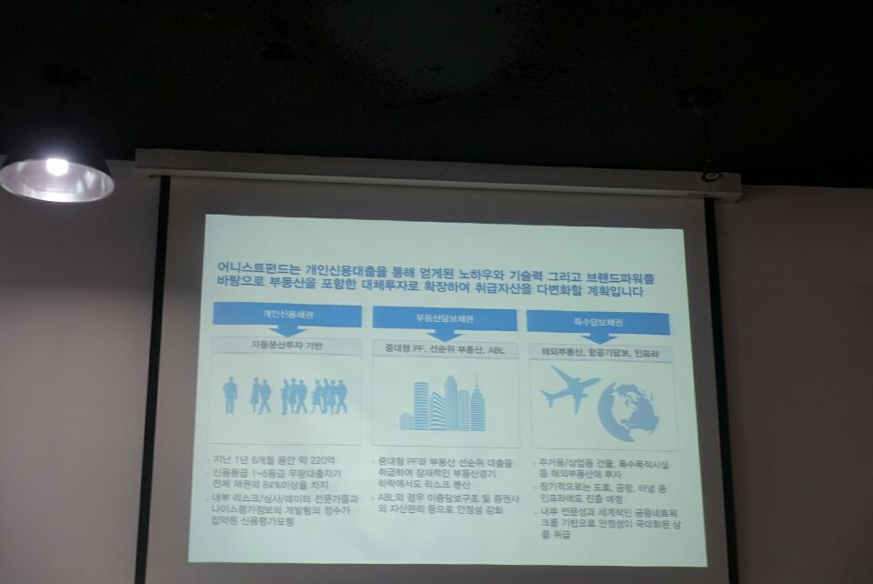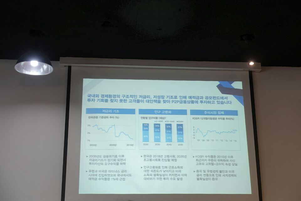 첫 번째로 이 행사의 사회자이시기도 했던 어니스트펀드의 서상훈 대표의 소개가 있었습니다. 어니스트 펀드는 개인 신용 상품을 시작으로 현재는 담보 등의 상품도 취급하고 있습니다. 추후 론칭 상품에 대한 힌트도 주었는데 하반기에는 해외 부동산 상품, 6월에는 항공기 담보 투자 상품도 준비 중이라고 합니다. 개인적으로는 고액자산가인 부자들이 주로 할 수 있었던 사모펀드 등에서 취급하던 대체투자 상품(전시회, 콘서트 등 문화콘텐츠나 인프라, 해외자산 등)들이 생긴다는 점이 반가웠습니다.