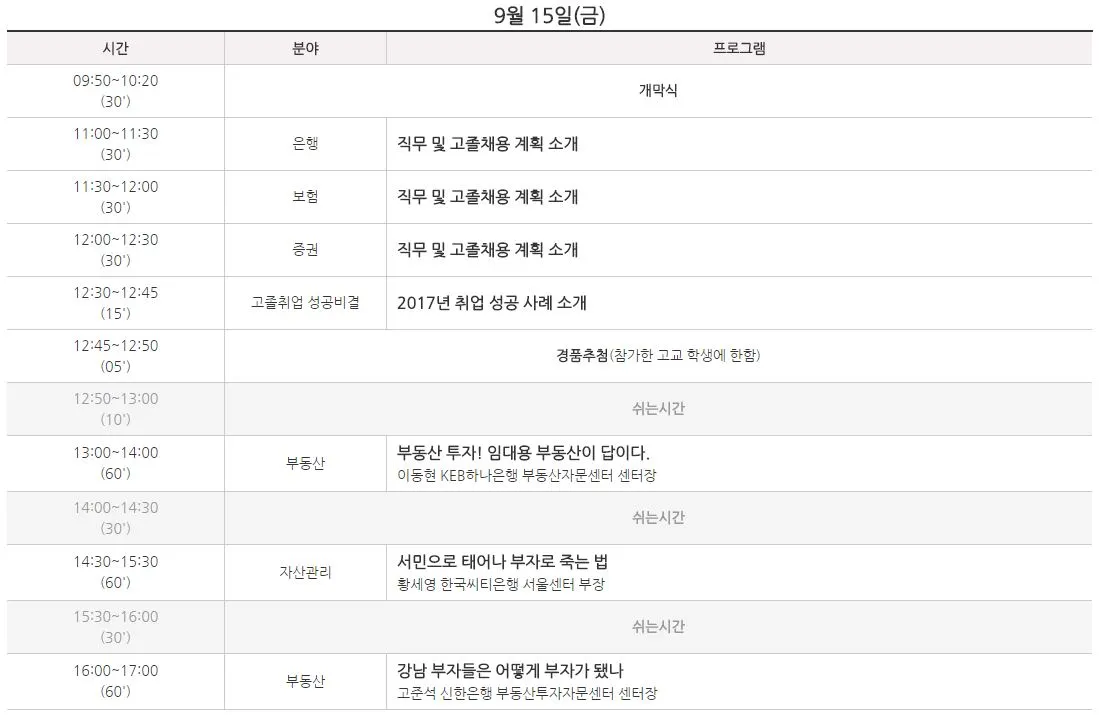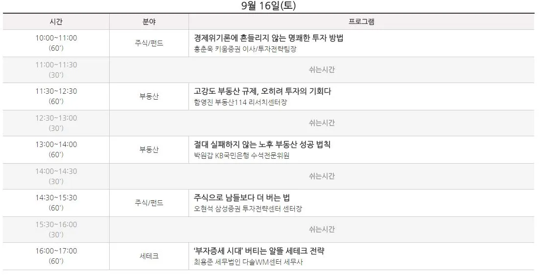 부스들은 어느 시간에나 방문할 수 있으니 가급적이면 관심있는 세미나 시간에 맞추어 방문하는 것이 좋을 것 같습니다. 그리고 개인 재무설계등도 받을 수 있는 부스들이 있을테니 평소 시간이 안되어 하지 못하셨던 분들은 받아보십시오^^ 단, 금융사 직원의 꾐에 빠져 덜컥 원치 않는 상품만 가입하지 않으신다면 괜찮습니다. 오늘만 기회입니다...라는 말은 믿지 마시길요.