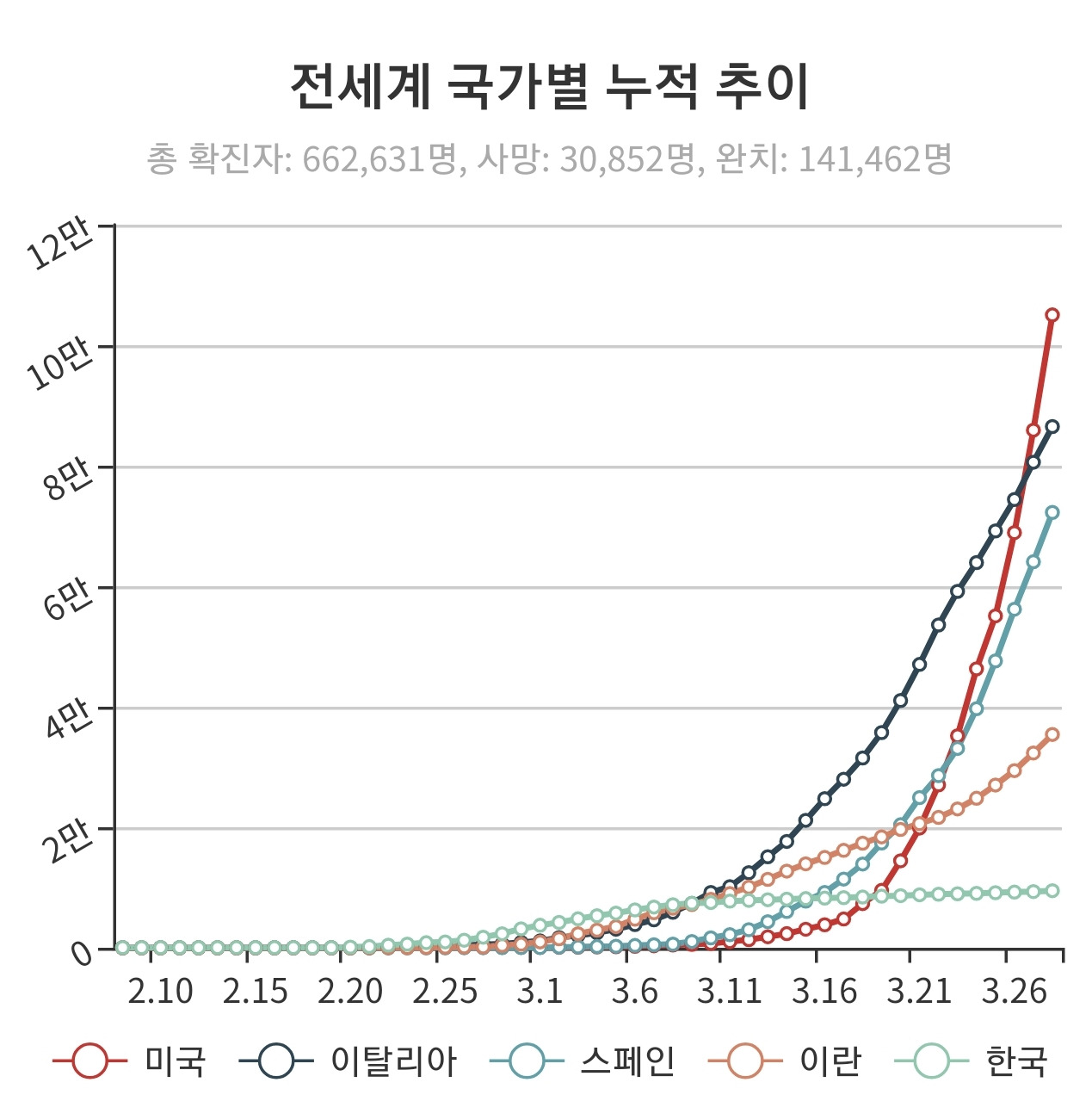 일주일 전만 해도 전 세계 확진자수는 20만 명, 사망자수는 1만 3천여 명에 불과했었다. 일주일 사이 3배가량 증가한 것이다. 엄청난 속도이다. 미국, 유럽 등은 계속해서 증가 추이가 상승하고 있는 만큼 전파력이 강하다는 코로나19 바이러스 특성상 앞으로의 증가 속도가 얼마만큼일지 예측하기가 힘들 것 같다. 일본 역시 올림픽 연기가 결정되면서 확진자 수 증가가 연일 최고치를 경신하고 있다.