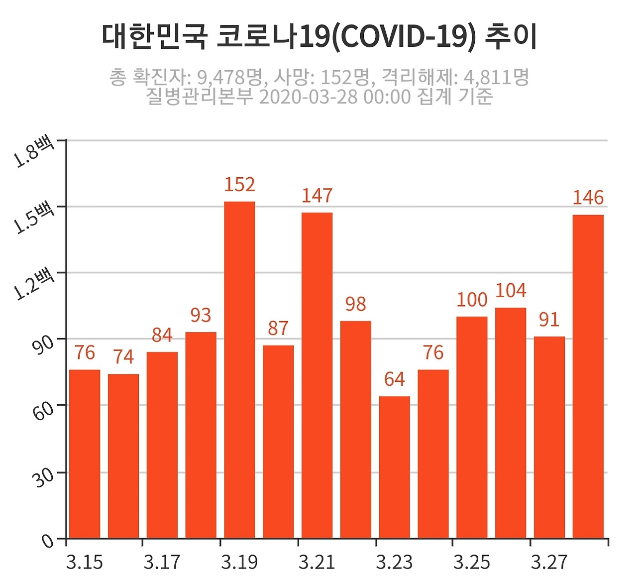 우리나라의 확진자 수 추이 역시 결코 안심할 수 없는 상황이다. 3월 초 하루에 500명 이상 확진자가 나왔던 상황보다는 개선된 것은 분명하지만 당시는 대구 지역 중심으로 확진자수가 증가했던 반면 최근에는 수도권 확진자수가 절반 정도 차지하고 있다. 특히 서울의 경우 인구가 상당히 밀집되어 있기 때문에 바이러스에 그만큼 취약할 수 있기에 여전히 조심해야 할 상황인 셈이다. 정부도 이 점을 의식한 듯 지난 21일부터 4월 5일까지 종교시설과 실내 체육시설, 유흥 시설에 대해서 운영 중단을 강력히 권고했다. 4월 6일 개학을 앞두고 '사회적 거리 두기'의 강도를 높이는 차원이다.