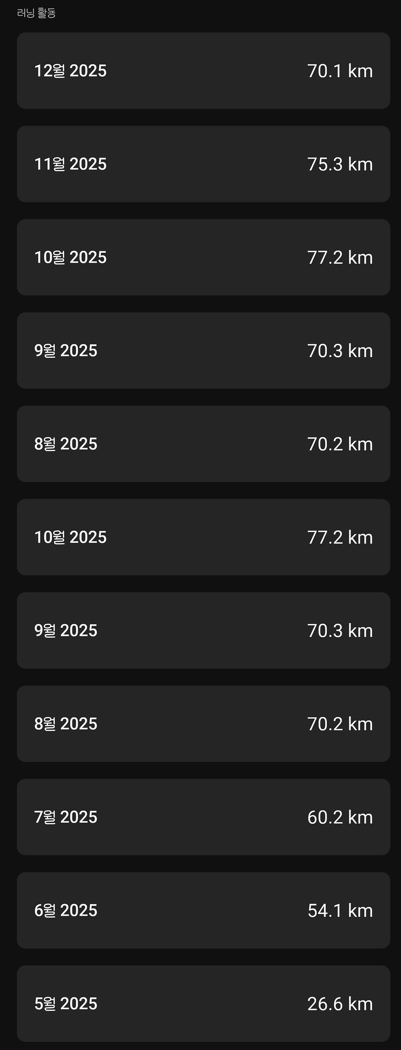 그때 뜻밖의 균열이 생겼다. 친구의 권유로 시작한 러닝이었다. 사실 작년까지만 해도 나는 '대회용 러너'에 불과했다. 대회 직전에만 겨우 두어 번 연습하는 게 전부였다. 그러다 지난 4월, 달리는 도중 멀쩡하던 스마트워치가 꺼져버린 사소한 사건이 내 러닝 인생을 바꿨다. 홧김에 지른 러닝 전용 워치에 내 발자국이 기록되는 것을 보며 묘한 쾌감을 느꼈다. 5월에 26km를 뛰었던 내가 이제는 매달 70km 이상을 달린다. 14년 동안 단 6번뿐이었던 대회 참여 횟수는 올해에만 9번으로 늘어났다.
