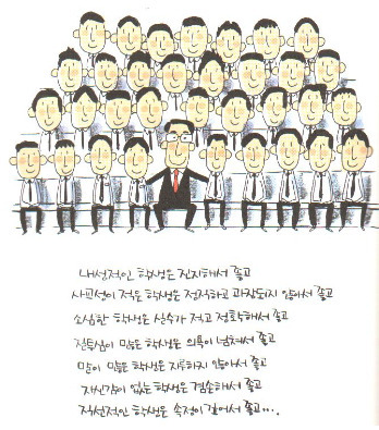 특히 [듣고, 적고, 시험보고-듣고, 적고, 시험보고] 만을 되풀이하는 학생들의 모습, 대학생이 되어서도 여전히 [듣고, 적고, 시험보고] 만을 되풀이 하다, 사회에 나간 기자들도 역시나 질문 없이 [듣고, 적고, 기사내고]로, 부모가 그토록 선망하는 출세자들도 당연히 서울대를 나와 여전히 [듣고, 적고, 그러다 구속]을 되풀이 한다는 장면에서 마냥 편하게 웃을 수만은 없었다.