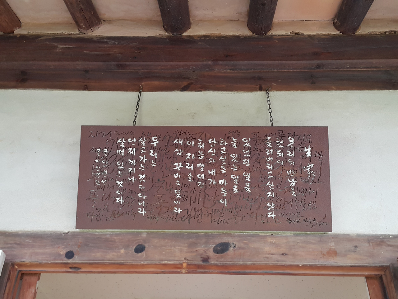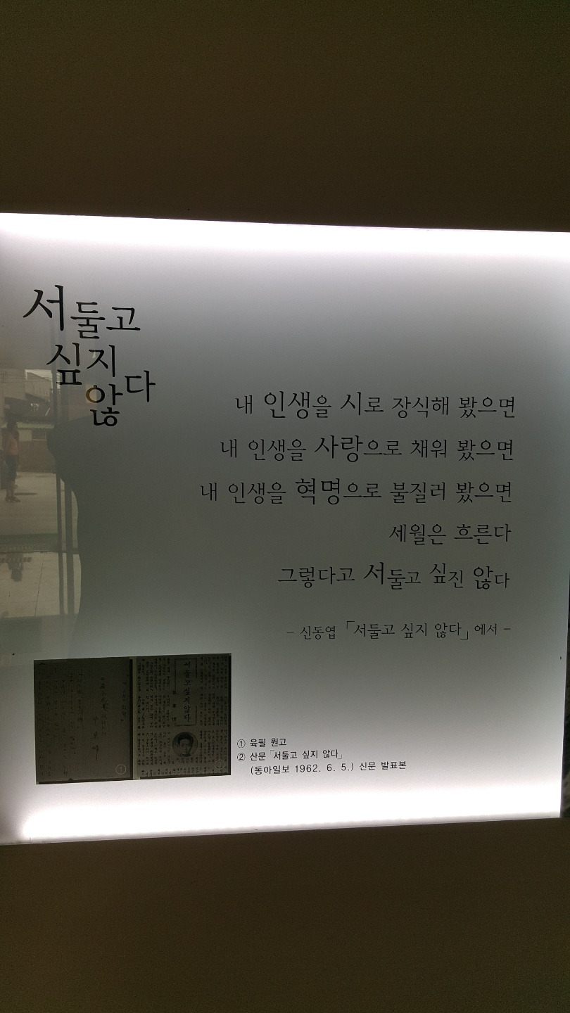2014년 11월은 내가 엄마를 잃어버린 때이기도 하다. 나의 첫 시집 ‘엄마를 잃어버리고’도 같은 이유로 지금 7월에 출간되었다. 내가 시를 쓰기 시작한 이유와 상통해서 마음이 더 쓰였다. 이 신좌섭 교수의 아버지가 바로 지금 내가 보고 있는 신동엽 시인이다. 사실 부여에 신동엽 문학관이 있는 줄 몰랐다. 어제 시외버스 터미널을 코 앞에 두고 내릴 준비를 할 때 내 눈에 들어온 것이 신동엽 문학관을 가리키는 이정표였다. 반갑고 설레는 마음이 그대로 되살아나 기분이 다시 좋아졌다.