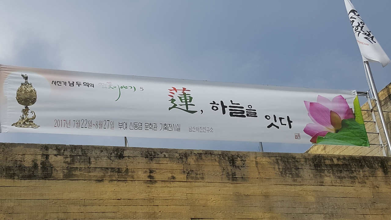 여행의 묘미 중 하나는 예상치 못 한 만남과 기쁨을 맞이할 때이다. 신동엽 문학관 기획 전시실에서 열리고 있는 사진전 관람이 그것이다. 마침 南山 남두희 사진 작가님이 계셔서 작품마다 친절한 설명을 들을 수 있었다. 이번 전시회는 ‘蓮, 하늘을 잇다’라는 주제로 열리고 있는데 벌써 5번 째 연작 전시회였다. 초입의 새벽 이슬이 가득한 연꽃부터 화사하게 산등성이 위에 떠오른 연꽃, 어둠의 등불로 은은하게 비추는 연꽃, 변화 무쌍한 빅토리아 연꽃까지 모두 궁남지 연꽃들이란다. 밤길에 방문하여 연꽃 하나 제대로 보지 못하고 나온 궁남지를 다시 가보고 싶어졌다. 전시회 관련 팜플릿과 현수막에 보이는 백제금동대향로 촬영에 대한 이야기도 들으니 부여의 상징인 대향로가 세세하게 들어왔다.