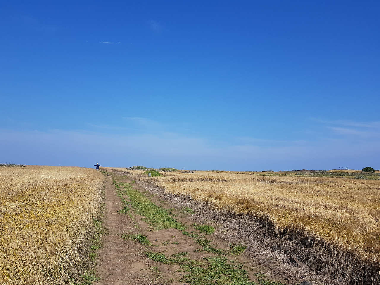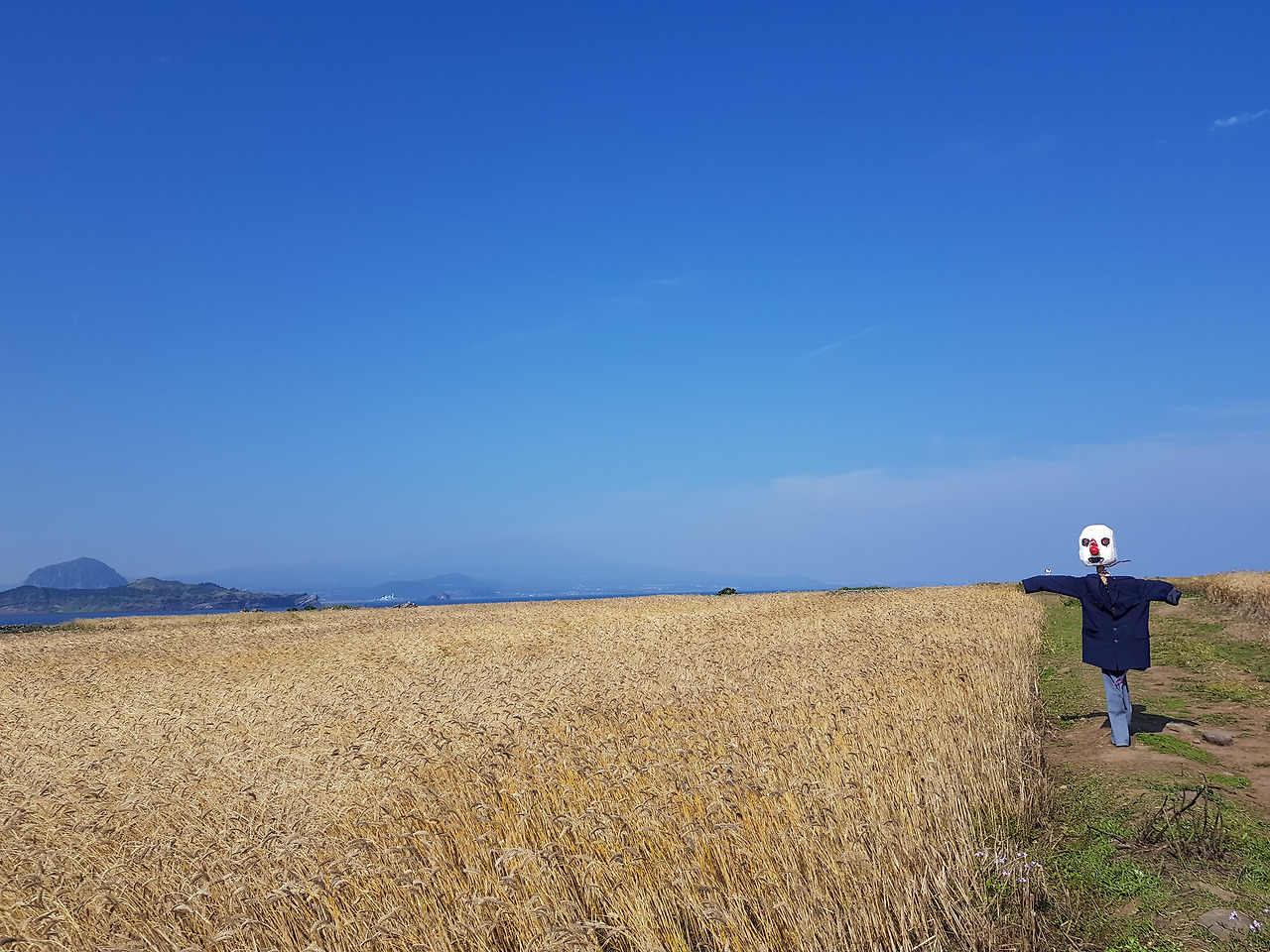 자전거로 해안도로 일주를 마치고 마을 중심으로 들어가 보리밭을 보았다. 황금물결이 파란 하늘과 잘 어울렸다. 보리밭에 서 있는 허수아비도, 영글어 고개 숙인 보리도 모두 다 아름답기 그지없었다.