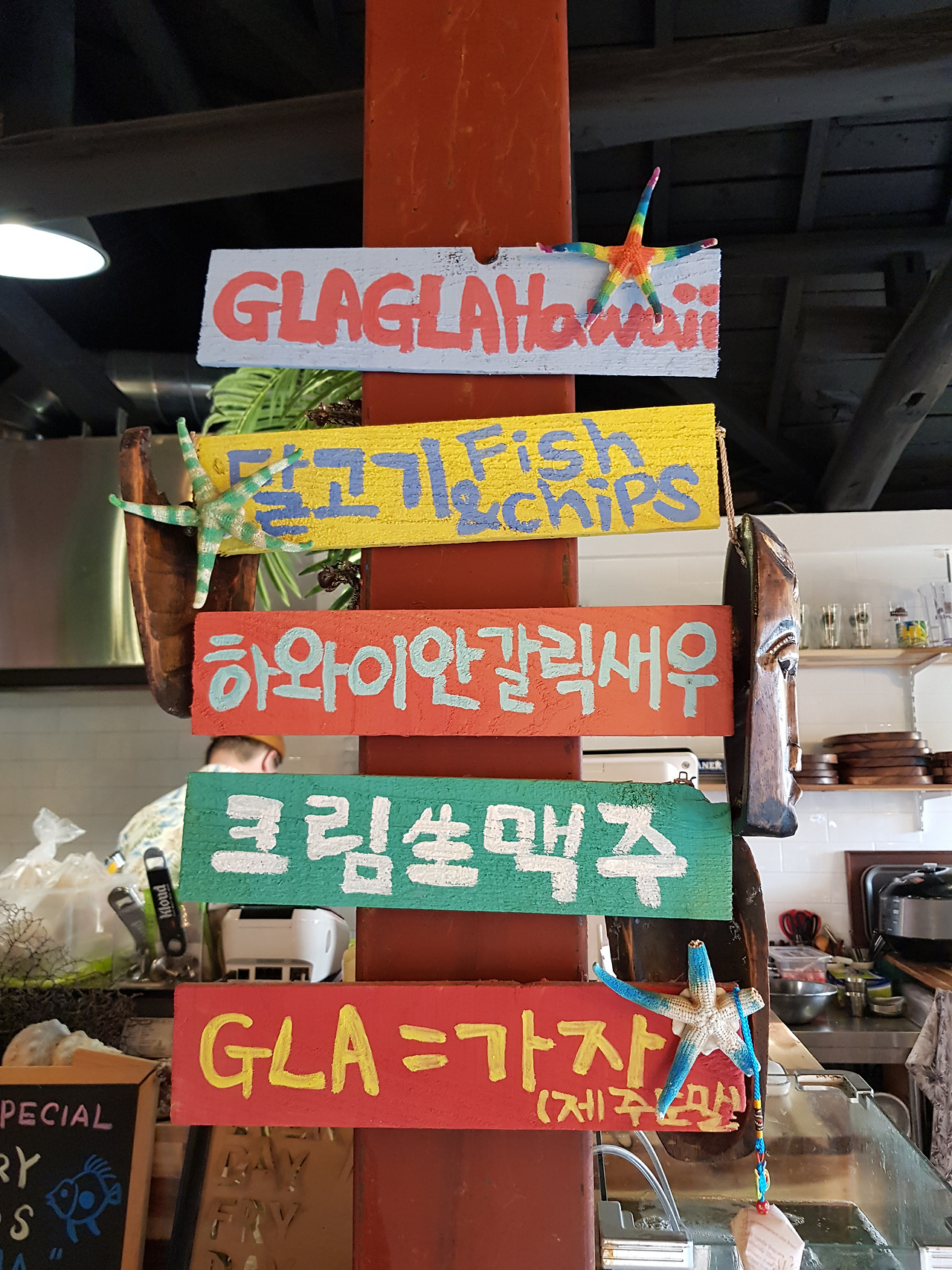 ‘제주 월간 맛집 지도’를 보고 가까운 곳을 찾았다. 외국인이 더 선호하는 하와이풍의 음식 전문점이라는 소개 글처럼 가보지 못 한 ‘하와이’를 느낄 수 있을 정도로, 음악도, 인테리어도, 직원의 옷차림도 하와이 풍이었다.