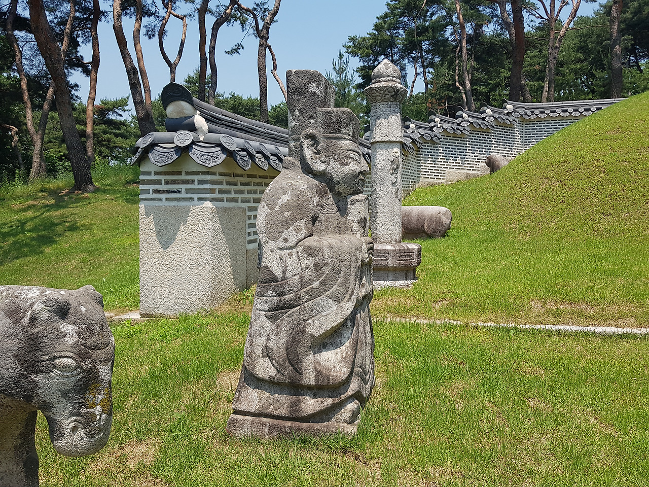 혼유석(영혼이 나와 노니는 곳)과 홀을 들고 서 있는 문석인