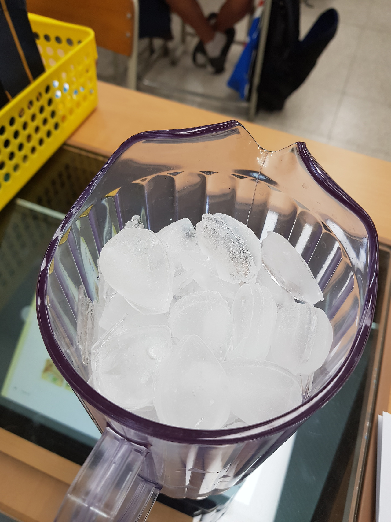 전날 6교시와 다음날 4교시 후에 한번 씩 얼려 아침과 점심시간에 얼음을 모으면 점심식사 후 늘어지는 5교시 수업을 위한 충분한 특별선물을 마련할 수 있었다. 1인당 2~3개씩 돌아가는 사소한 얼음이지만 나눠주고 받아먹는 그 짧은 시간이나마 입안에서 차가운 얼음을 돌리며 우스꽝스러운 말투로 친구들과 살짝 여유를 찾기도 하고, 손바닥과 입안이 차가워짐을 느끼며 졸음을 미뤄 보기도 한다. 입을 오물거리며 책을 펴고 학습지를 그때라도 챙기는 아이들을 볼 때면 그것이 모두 얼음으로나마 다가서려는 선생님의 마음을 센스 있게 눈치 챈 결과라고 생각하며 오늘도 얼음을 얼리고 있다.