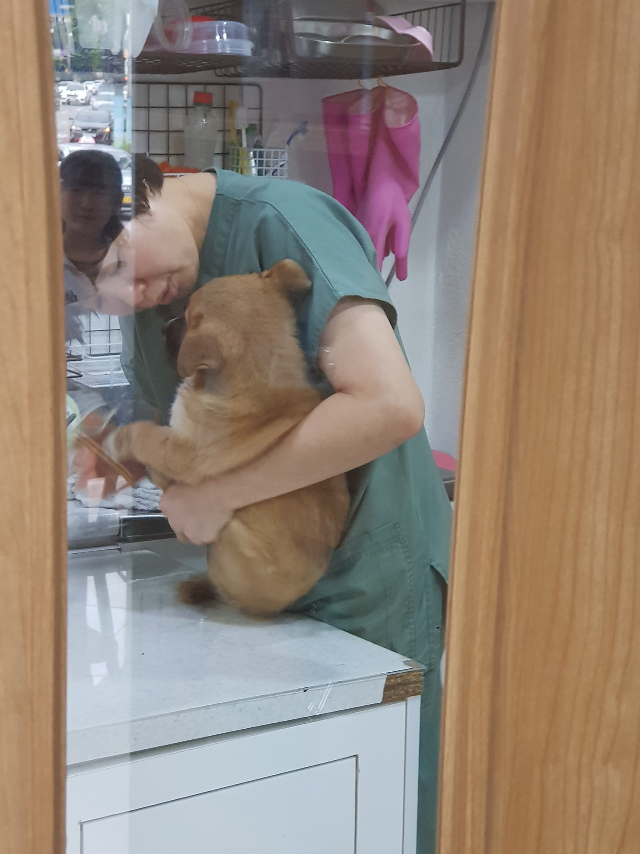간호사 손에 덜렁 안겨 매달리다시피 진료실로 들어가면서도 끽 소리 한번 안 낸다. 유리창에 비친 ‘잡채’는 간호사가 귀를 소독하고, 발톱을 깎고, 털을 잘라 주는 동안에도, 간호사들이 귀엽다고 쓰담쓰담 하는 중에도 꼼짝 없이 눈치만 보고 있다.