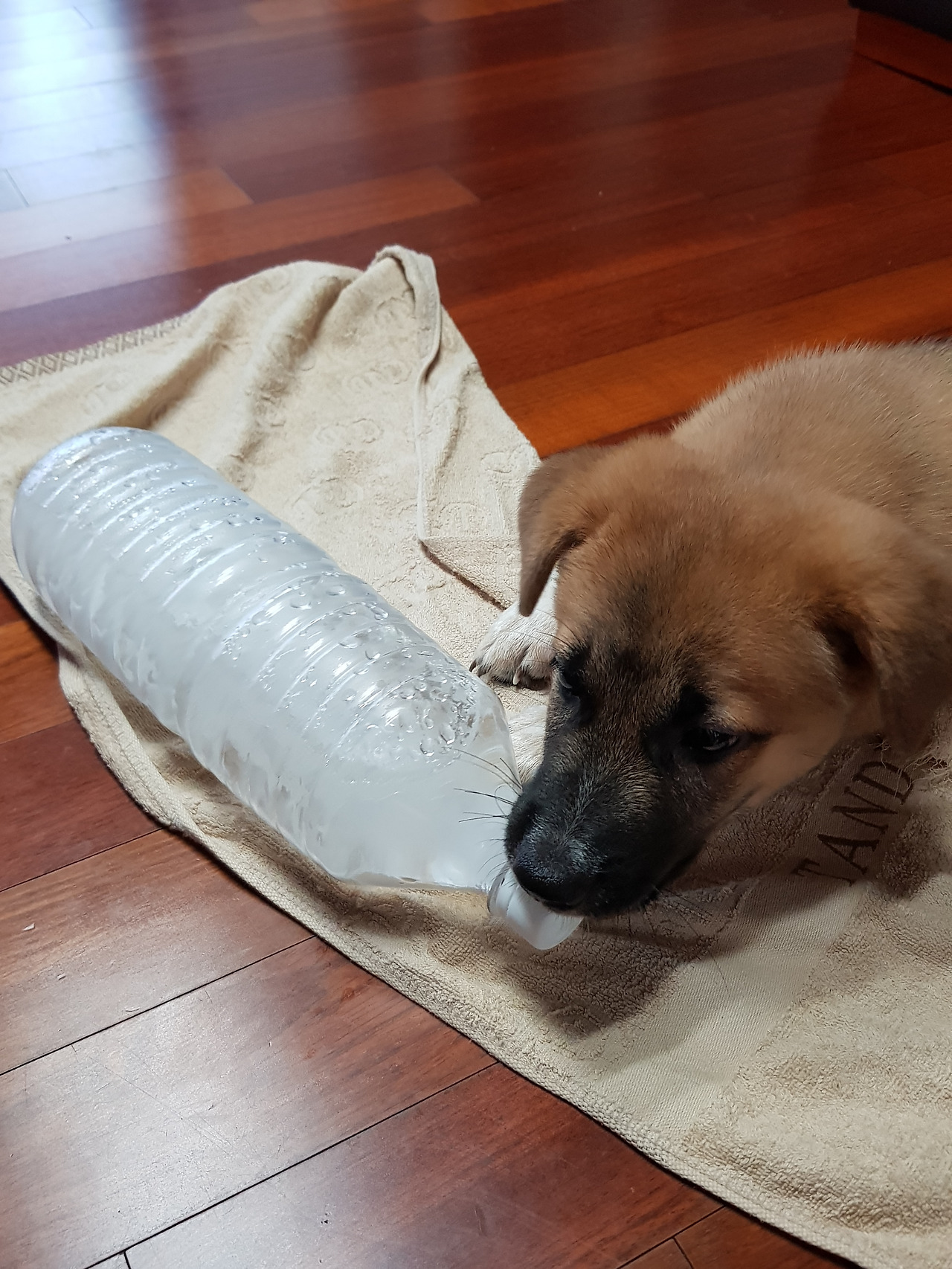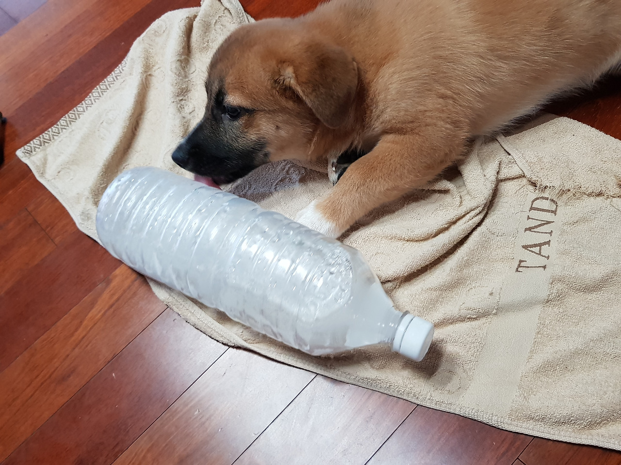 폭염은 우리뿐만 아니라 ‘잡채’도 괴롭기는 마찬가지였는데, 혀를 내밀고 심하게 헐떡일 때는 많이 안쓰러웠다. 시원한 얼음물을 주다 페트병에 물을 얼려 주니 날름날름 페트병을 핥으며 시원하게 잘 가지고 놀았다. 한참을 논 최종 결과는 역시 아작아작 물어뜯은 뚜껑 분리 성공이었다.