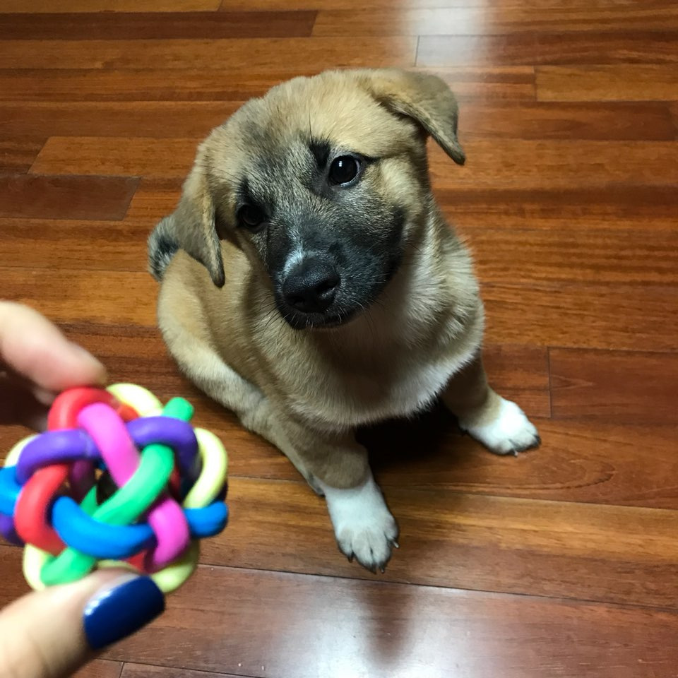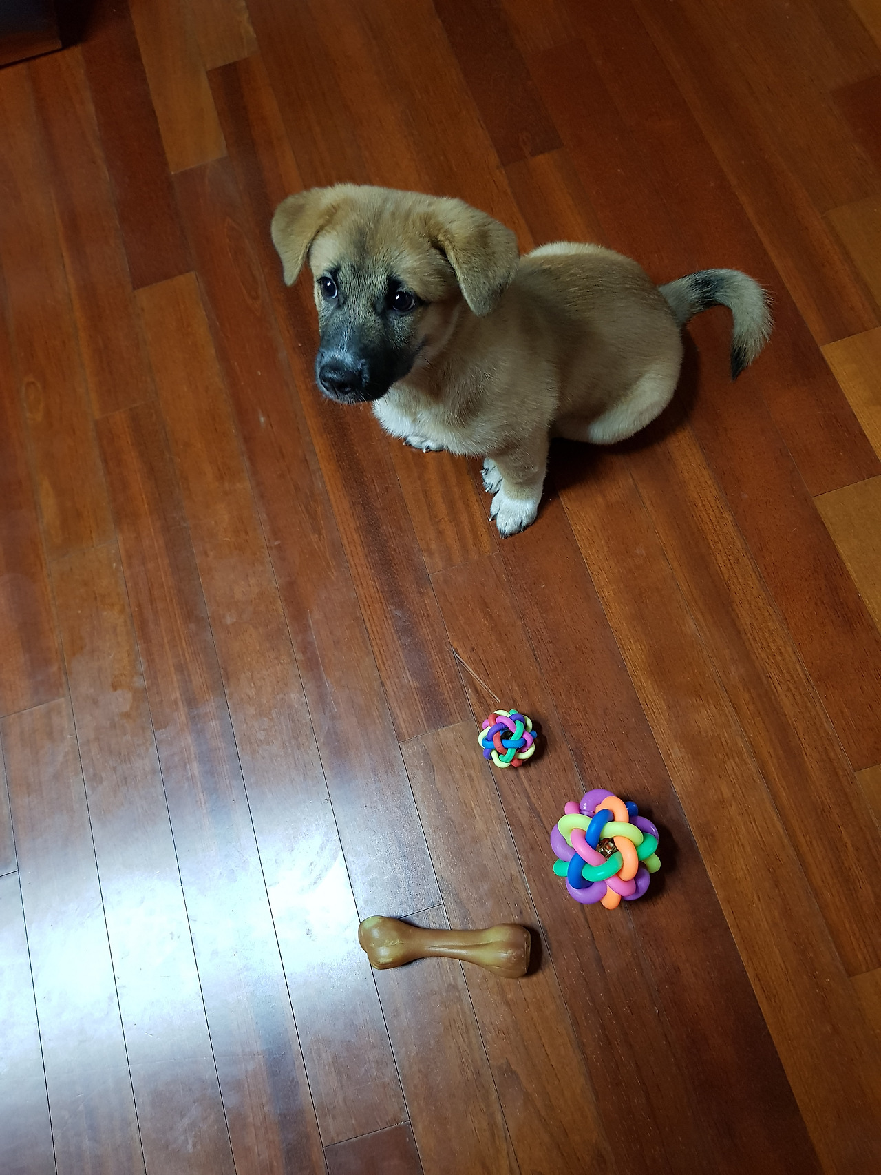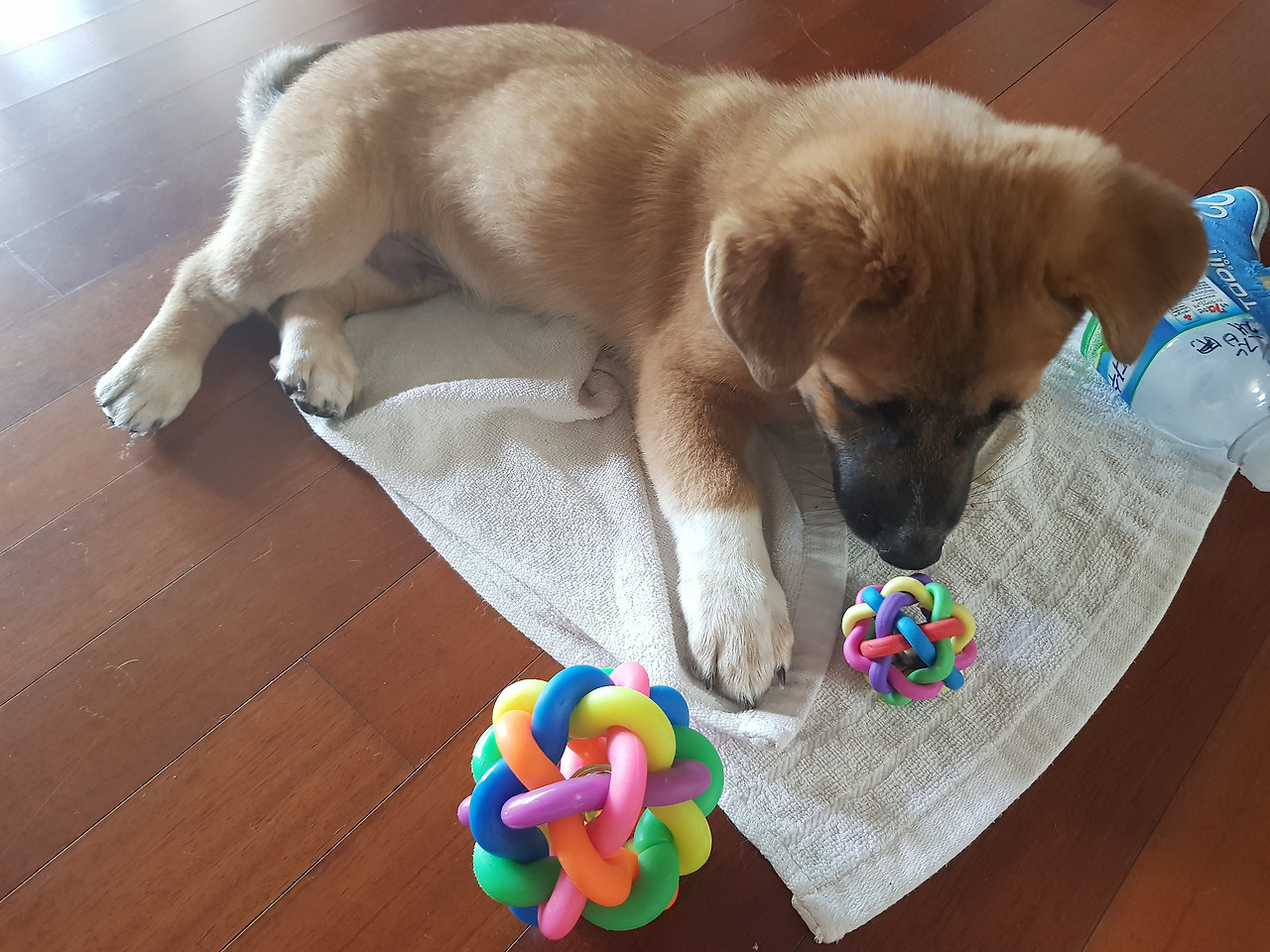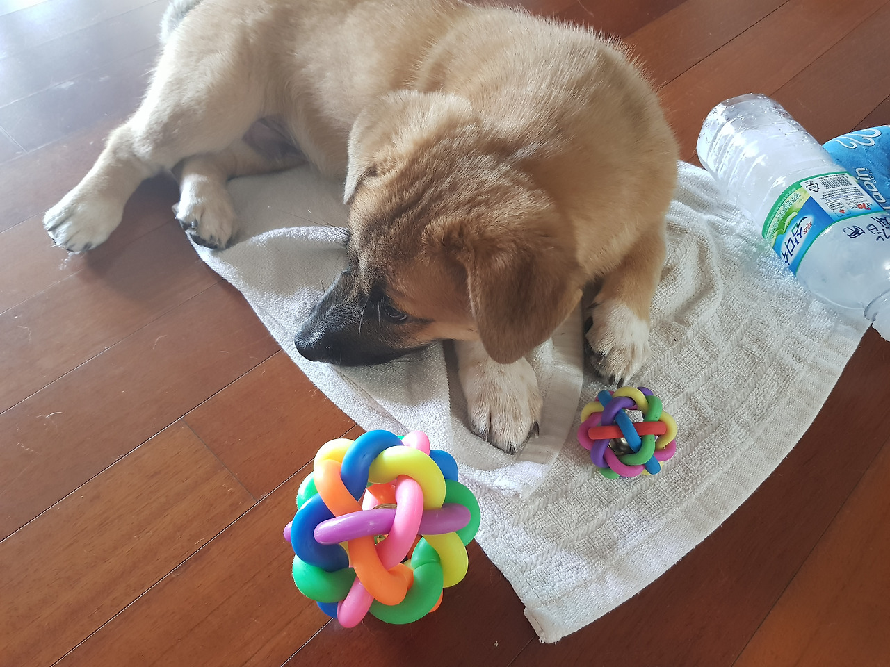 아직 어려 간식은 줄 수 없다 하여 여러 가지 실리콘 재질의 장난감을 사다 주니 이리저리 돌려가며 침 범벅을 만들어 물고 뜯고 너덜거리게 만들어 놓았다. 첫째가 사다 준 딸랑이가 들어 있는 놀잇감은 ‘잡채’가 대형견이 될 아이임을 잠시 잊어버린 티가 뚜렷이 나는 크기였다. 곧 다시 ‘잡채’가 만족할 만한 크기의 딸랑이로 교체해 주었다.