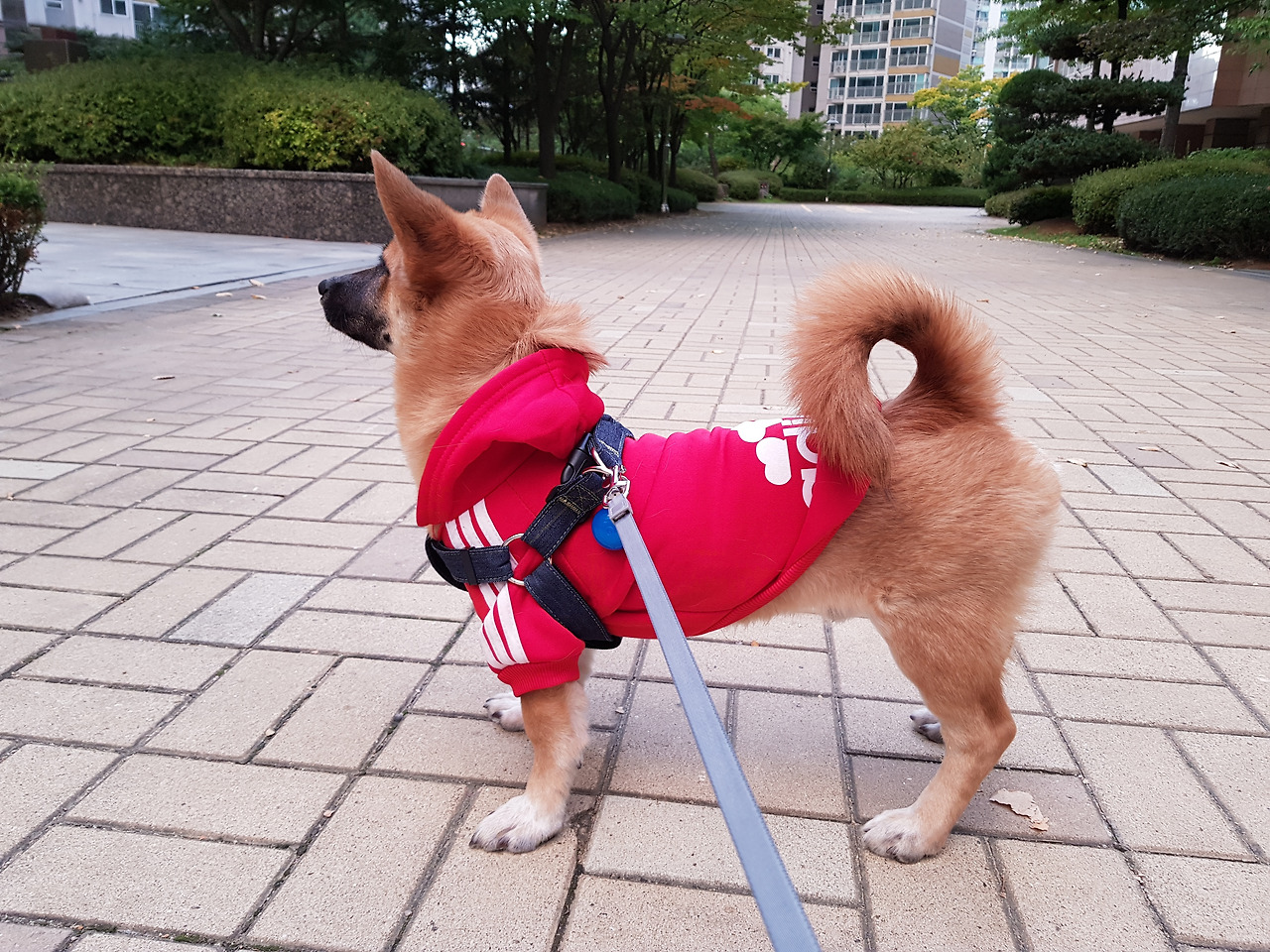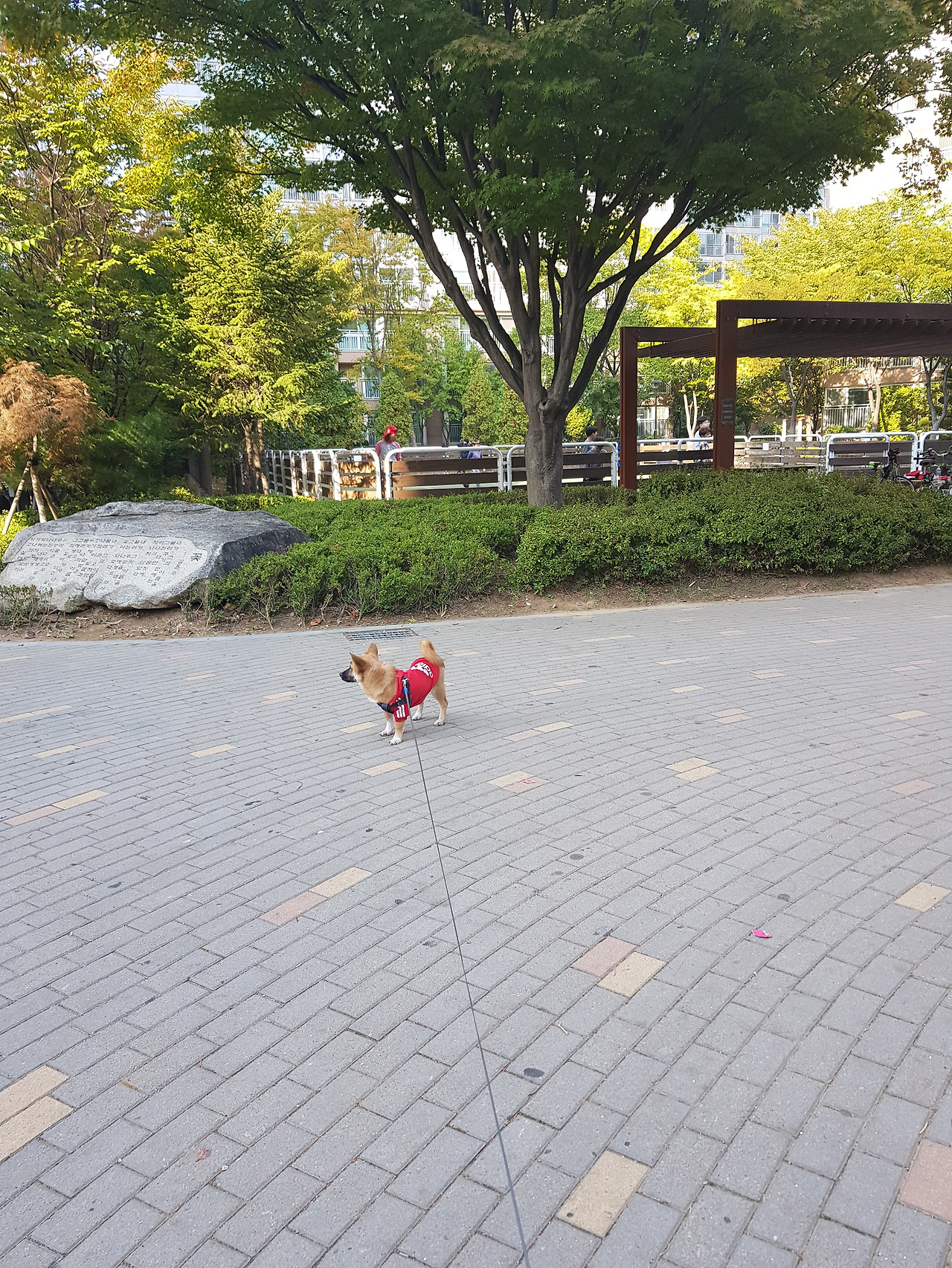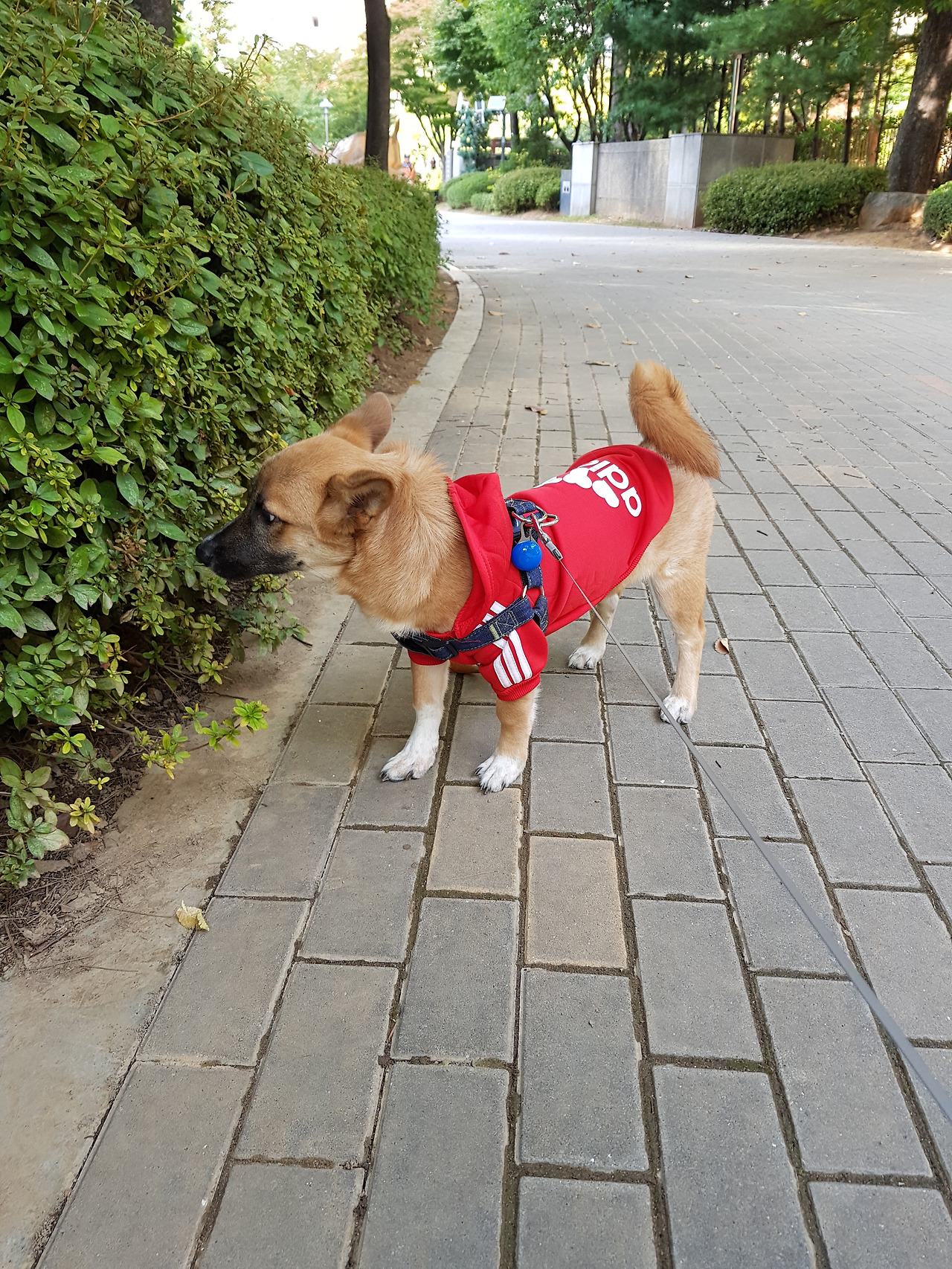 ‘잡채’와 가장 잘 어울리는 빨간 색깔의 ‘adidog’ 옷을 입고, 가슴 줄을 착용하고, 자동 리드 줄을 장착한 후 현관문을 나선다. ‘잡채’의 산책길 코스는이미 정해져 있다. 40여분 이상의 산책을 통해 ‘잡채’가 어디서 머무는지, 어디서 뛰는지, 어디를 지나치는지 뻔히 알게 되었다. ‘잡채’가 머무는 곳에 나도 따라 머물며 ‘잡채’가 가는 길을 따라가다 보면 1시간이 훌쩍 지나간다.