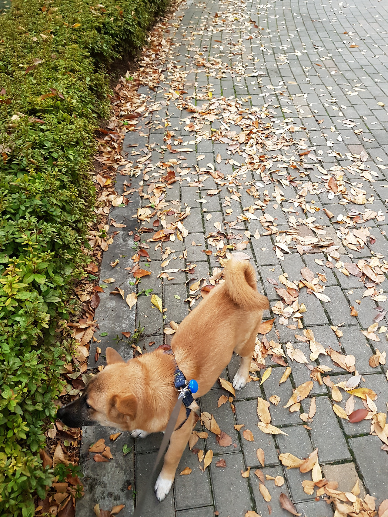 말귀도 기가 막히게 잘 알아듣는다. 낮은 키의 꽃나무에 꽂혀 한참 머물더니 요즘엔 단풍잎 더미에서 떠날 줄을 모른다. 늘 그렇듯 냄새 맡고, 코를 들이밀고, 핥기도 하며 자신의 영역을 표시하고 자리를 뜬다.