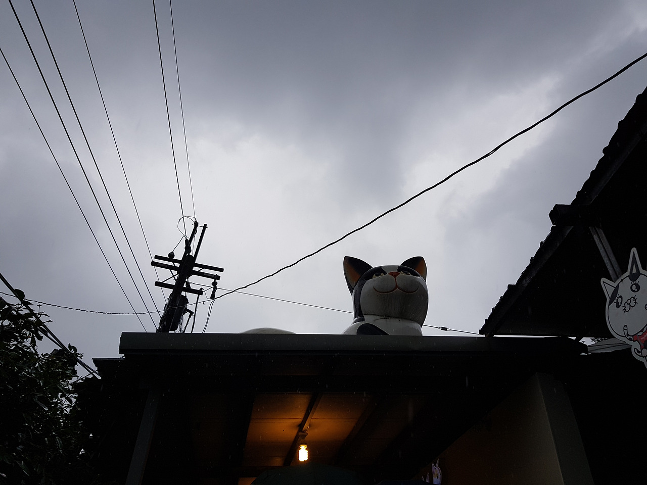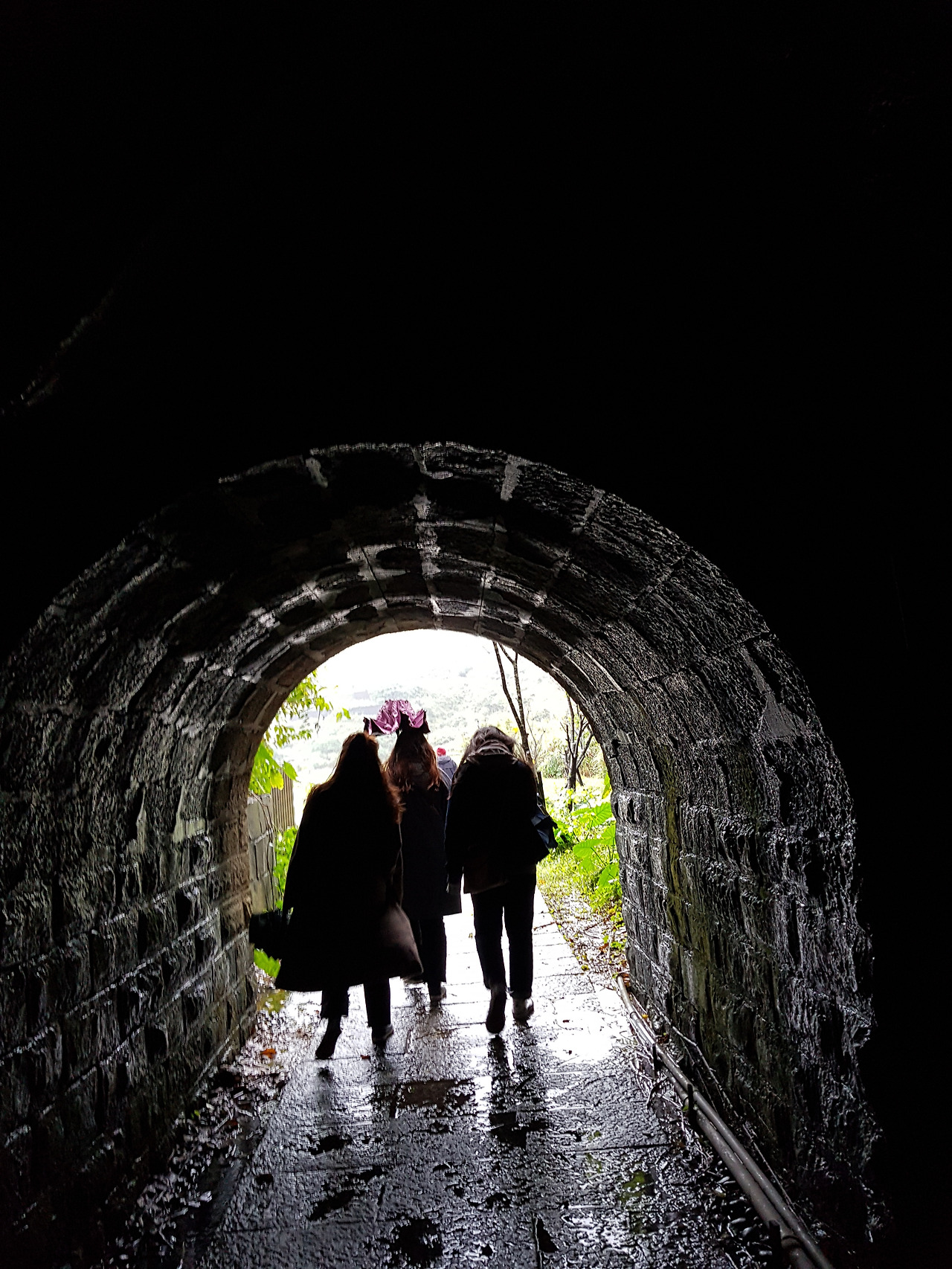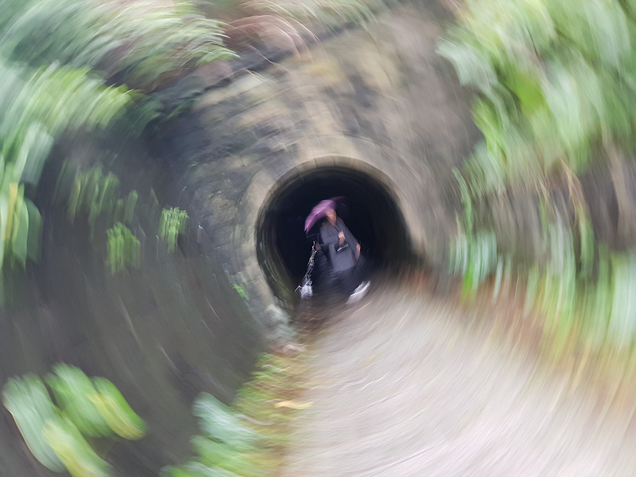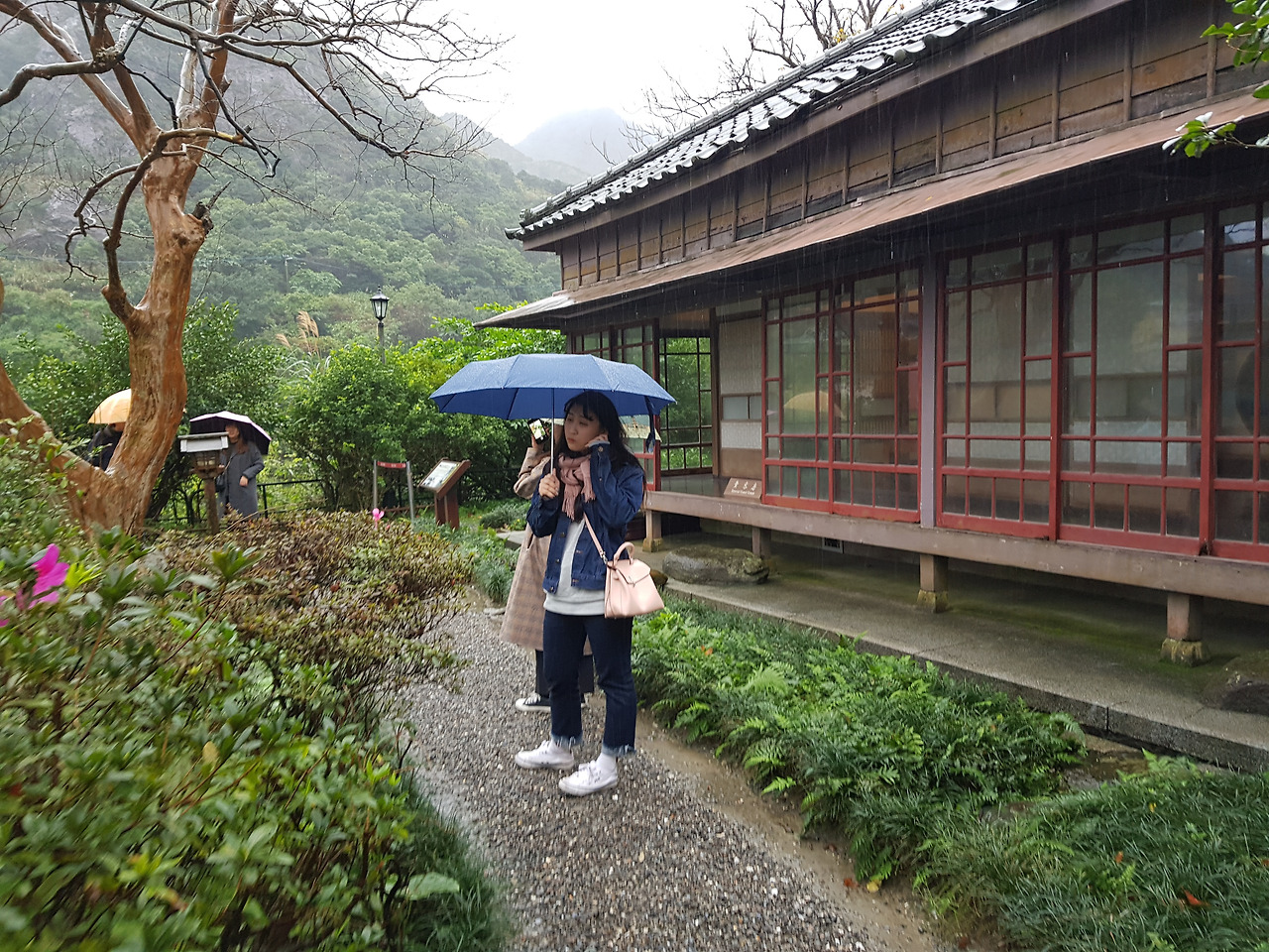 비바람이 몰아치는 산꼭대기에서 휘어지는 우산을 겨우 붙잡으며 몸을 지탱했다. 어딘지도 잘 분간할 수 없는 곳(우리가 본 것이 ‘음양 해’라는 바다였을까?)이었으나 곧 익히 들은 동굴이 나왔다. ‘센과 치이로의 행방불명’의 배경이 되었다는 동굴을 찾아 거닐어 보았다. 아이들 어릴 때 함께 보았던 영화 내용이 나에게는 희미하건만 아이들은 용케 영화의 장면을 떠올리며 신기해했다.