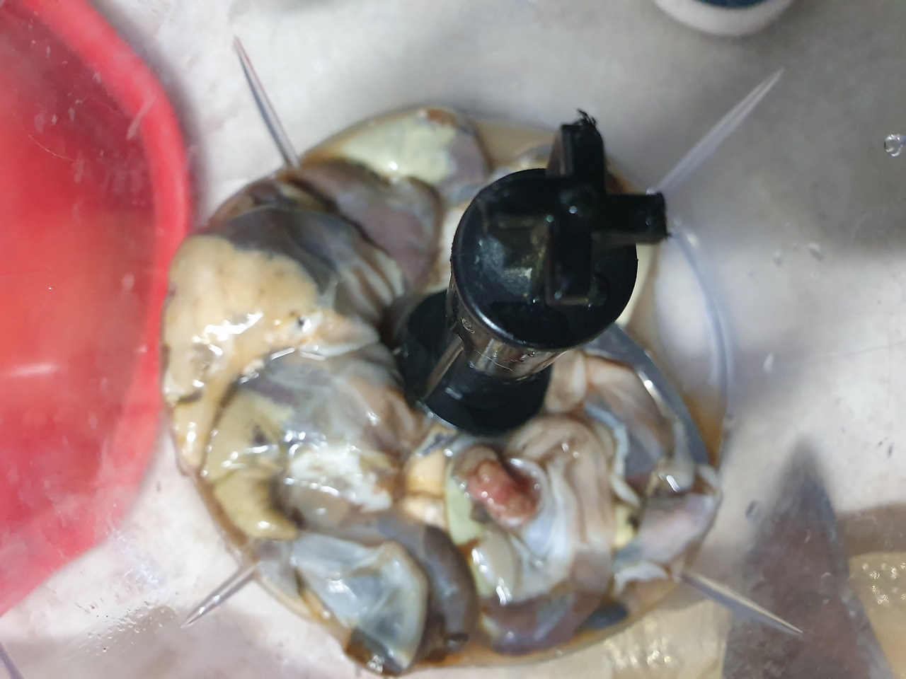 ♡ 전복 살은 먹기 좋은 크기로 듬성듬성 자르고, 내장은 따로 믹서기에 약간의 물과 함께 넣어 간다.