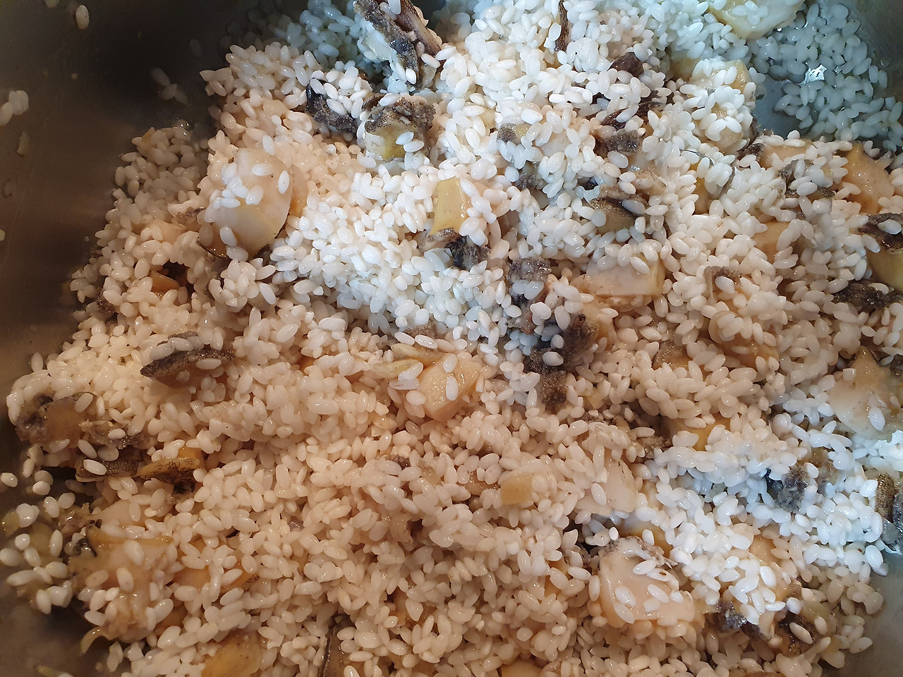 참기름에 전복을 달달 볶다가 쌀을 넣어 함께 볶는다.