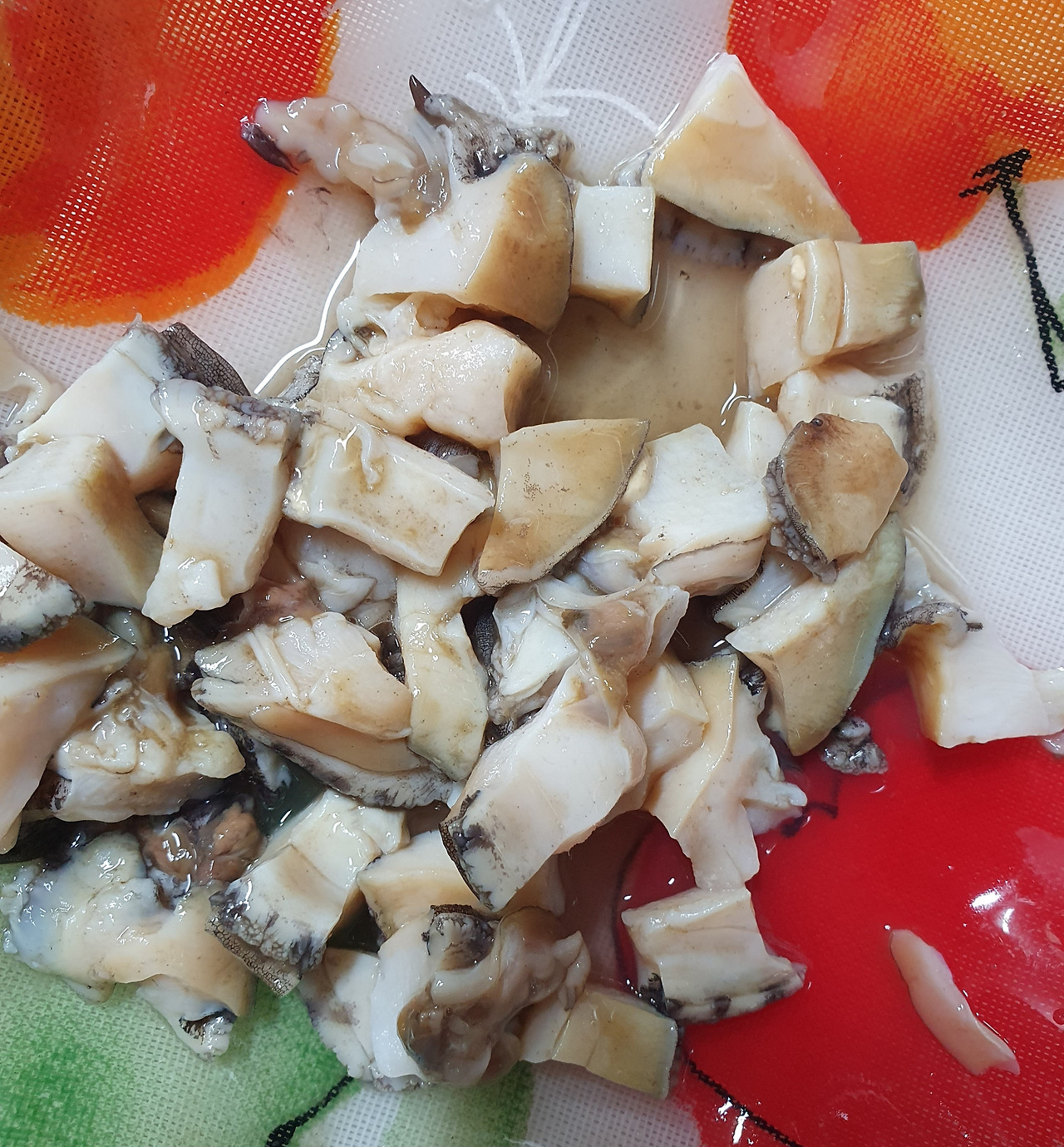 전복살을 떼어내 입을 제거하고 듬성듬성 사각으로 썬다.