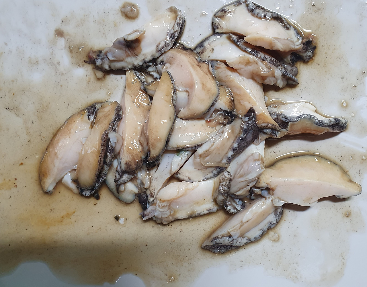 ♡ 전복을 맑은 살이 보이도록 깨끗이 씻는다. 빨판과 옆 부분의 살을 솔로 깨끗이 씻는다.