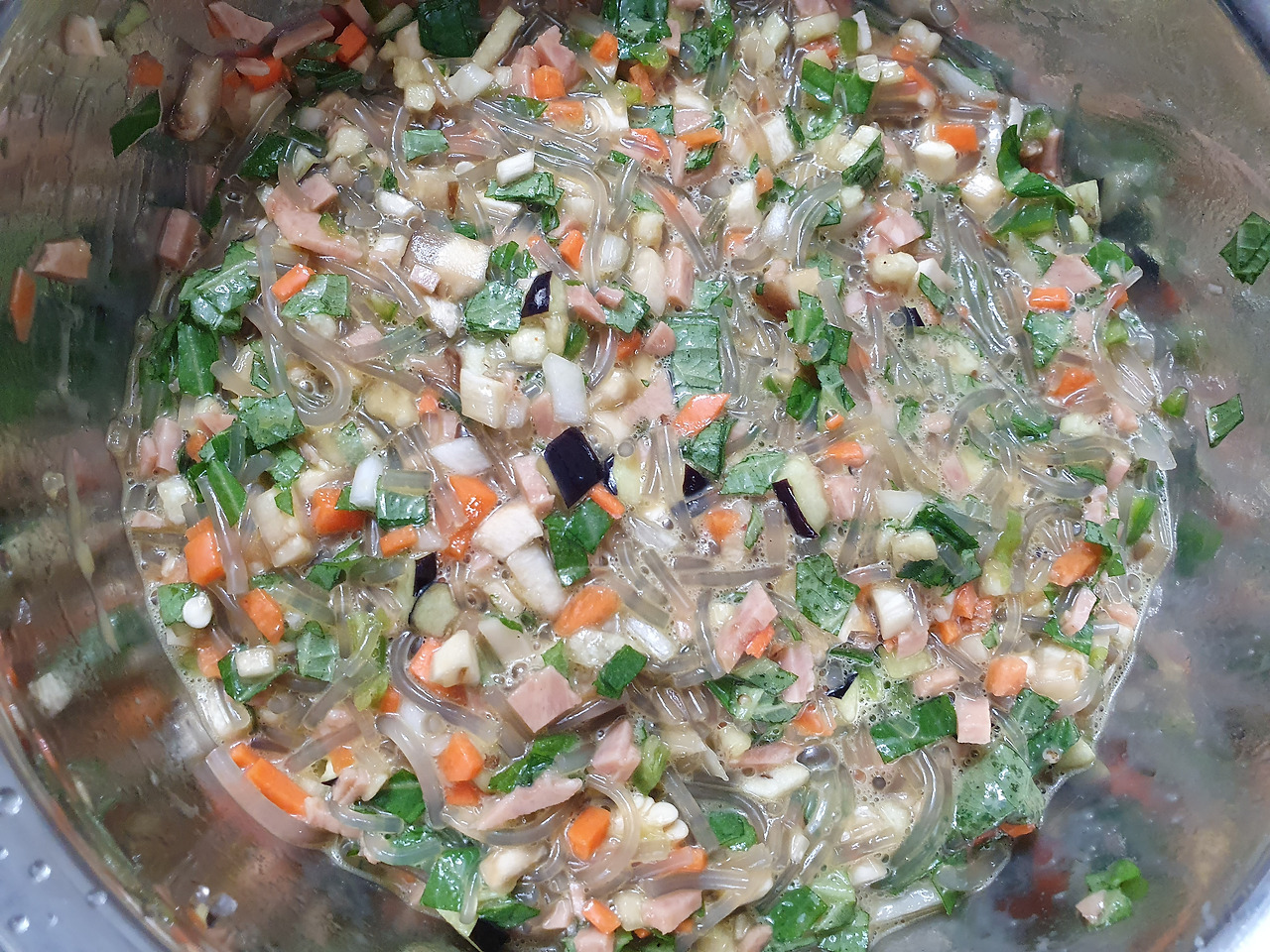♡ 당면을 물에 적당히 불려 삶아 물을 뺀 후 짧게 다진다.