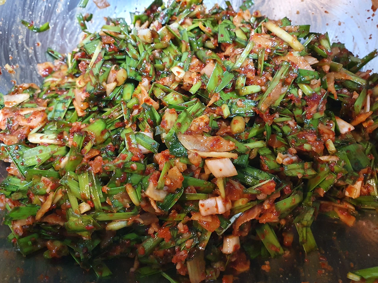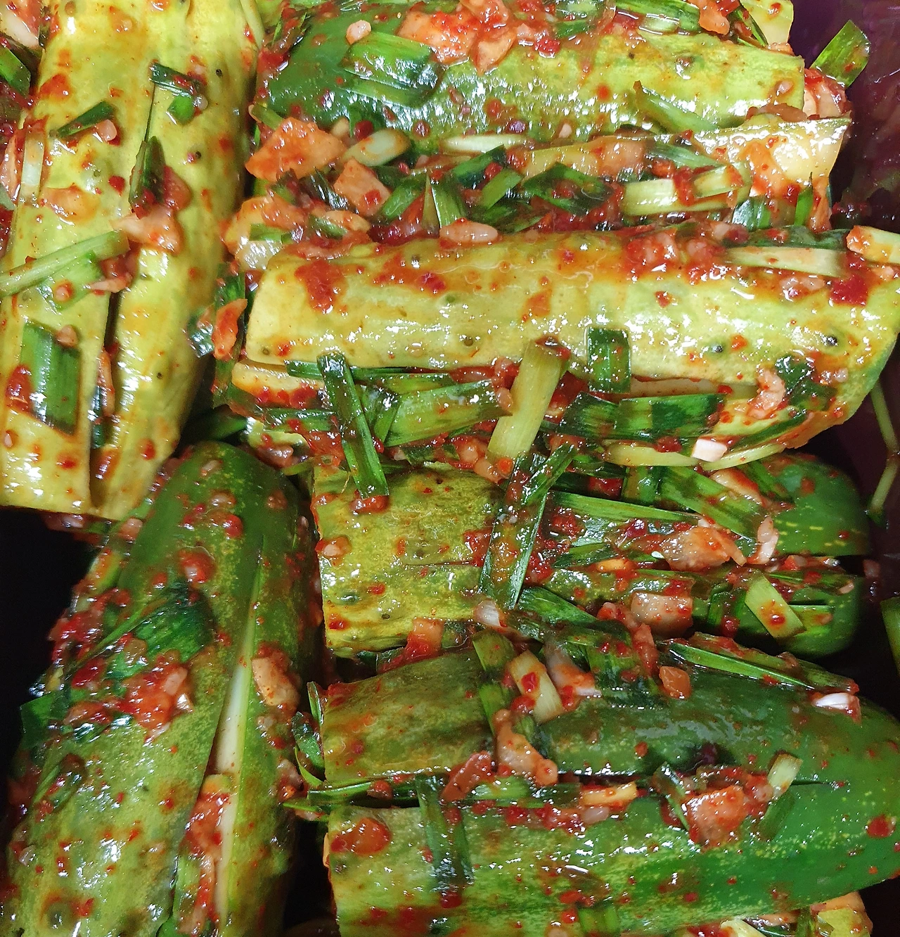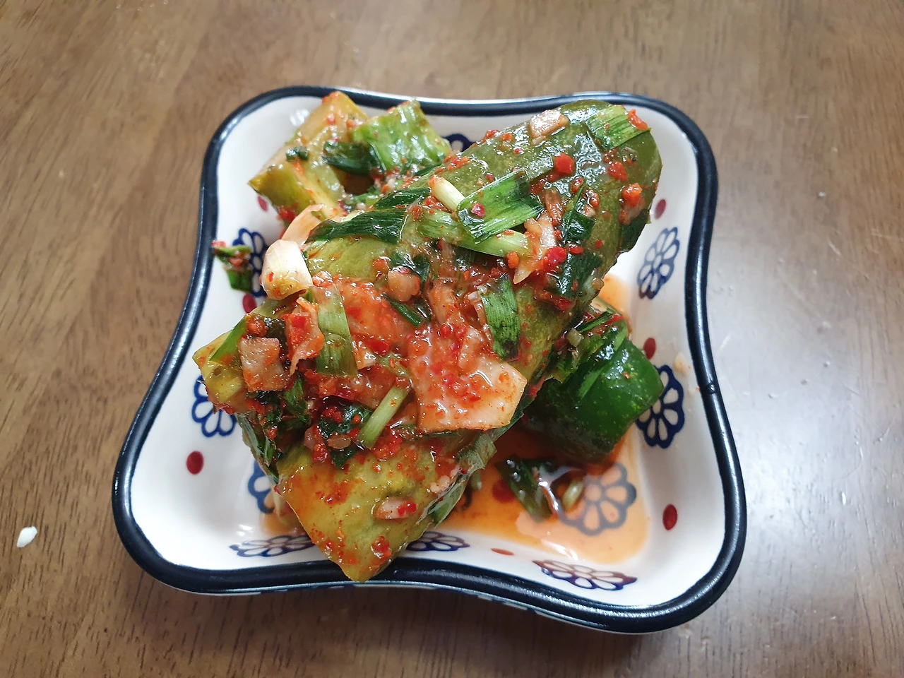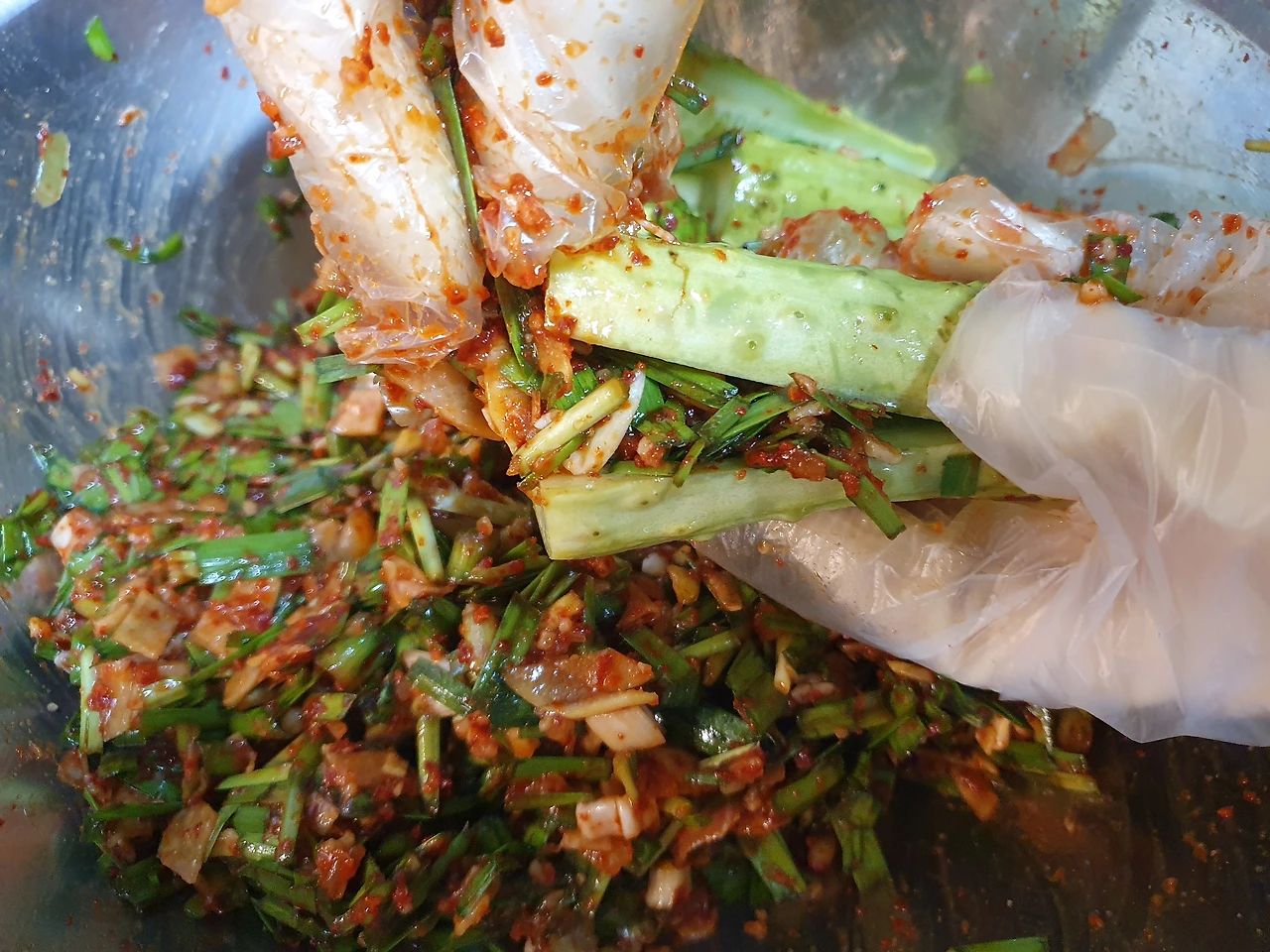 양념에 쫑쫑 썬 부추, 쪽파와 무를 넣어 버무려 완성한 속을 오이에 야무지게 꼭꼭 채워 넣었다.