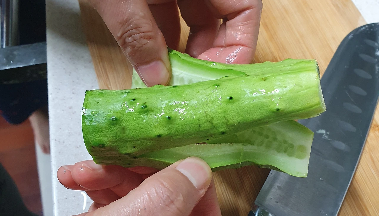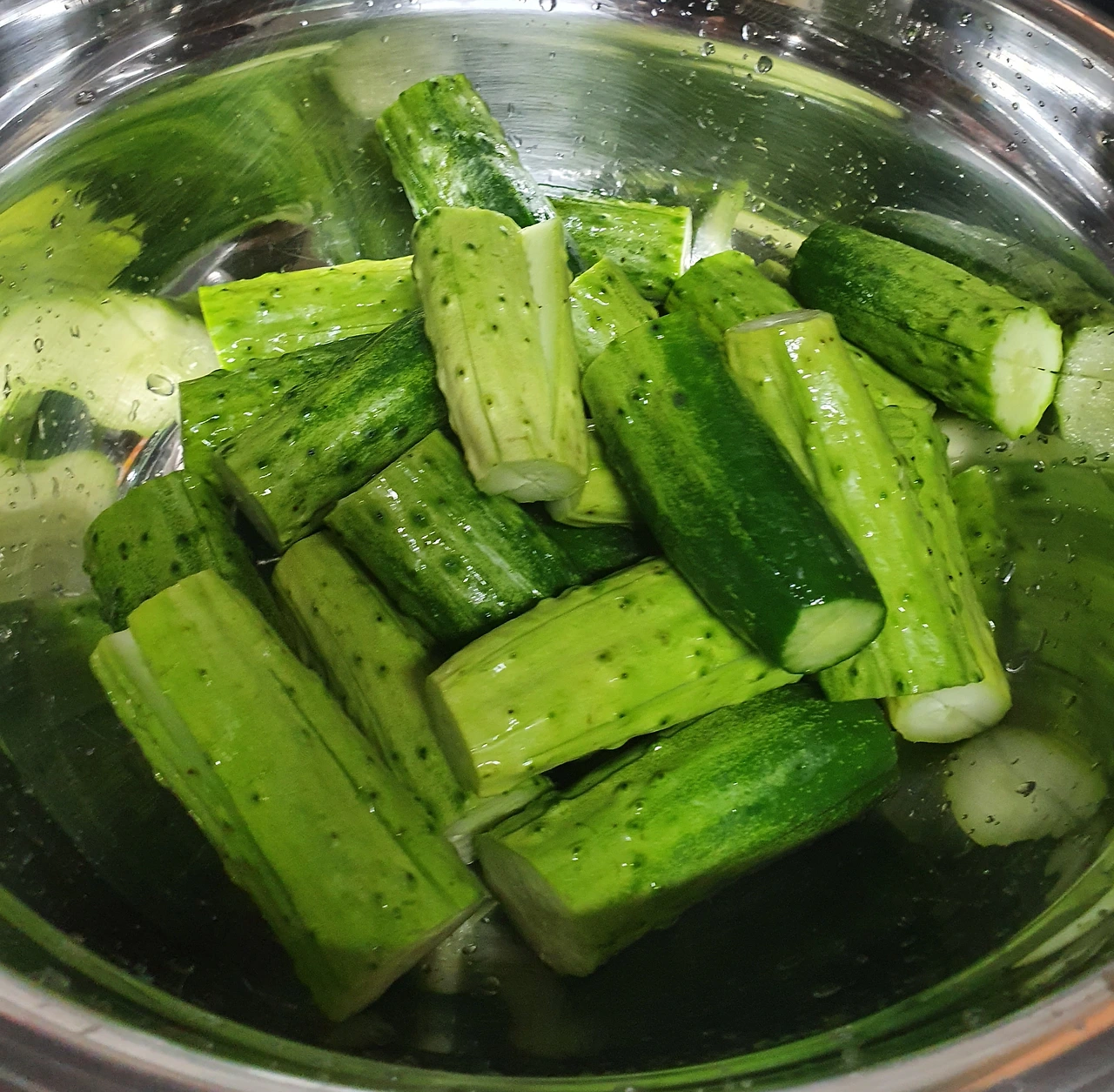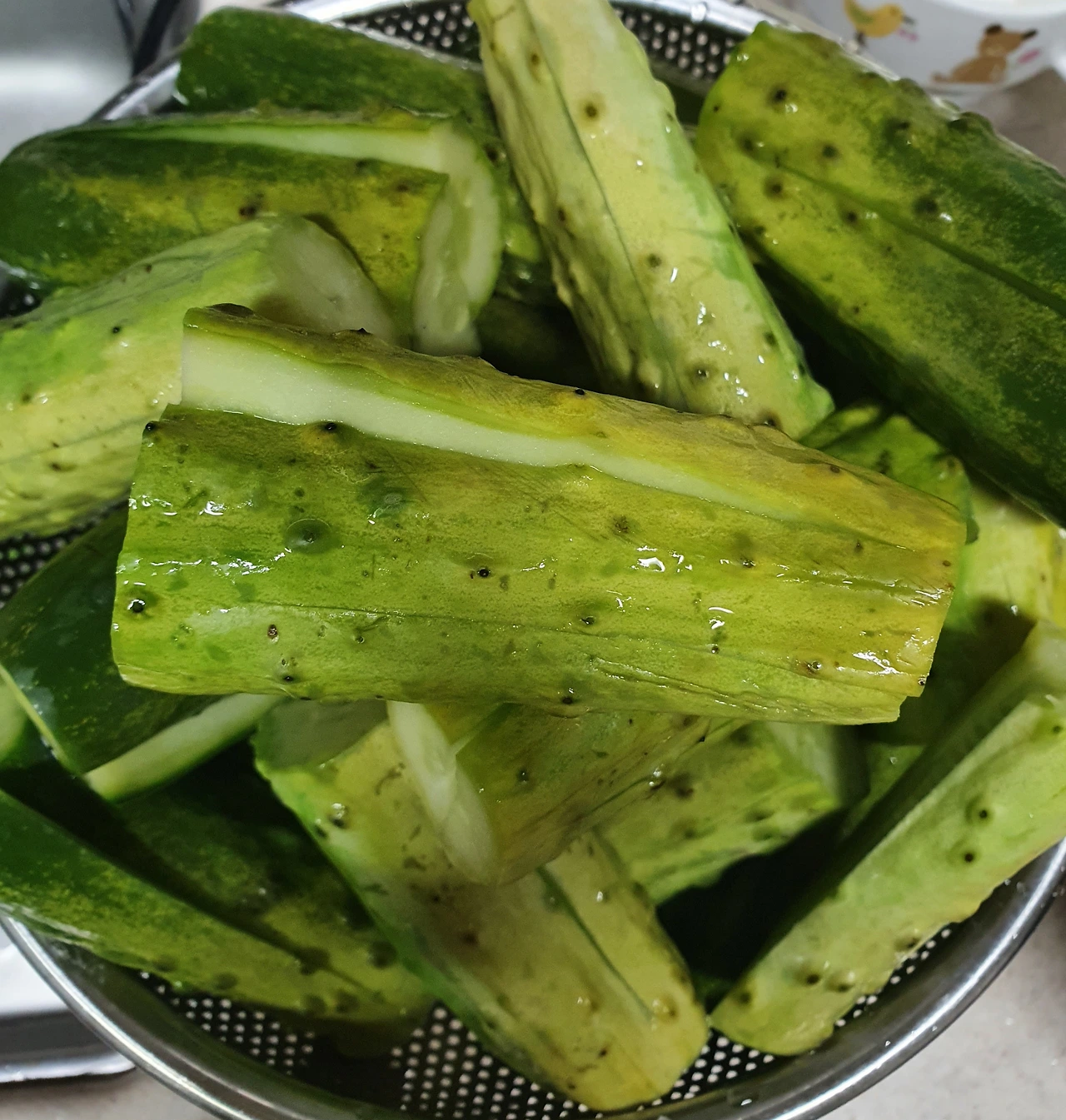 오이를 소금물에 박박 씻은 후 동네 반찬가게 사장님이 하듯이 양쪽으로 나눠 칼질을 하여 쌍방향 열십자 모양을 내었다.