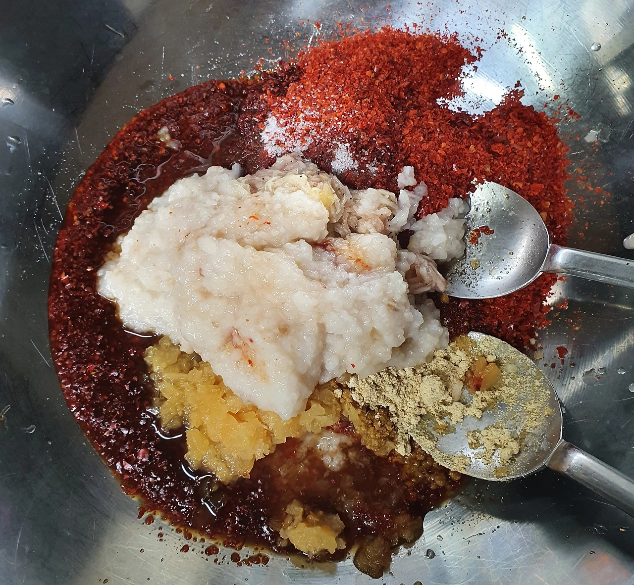 오이 12개 분량 양념=고춧가루(10) + 액젓(6)+마늘(1)+새우젓(2)+양파 간 것(4) +설탕(4)+ 생강가루(1)+밥풀(4) = 1큰술 기준