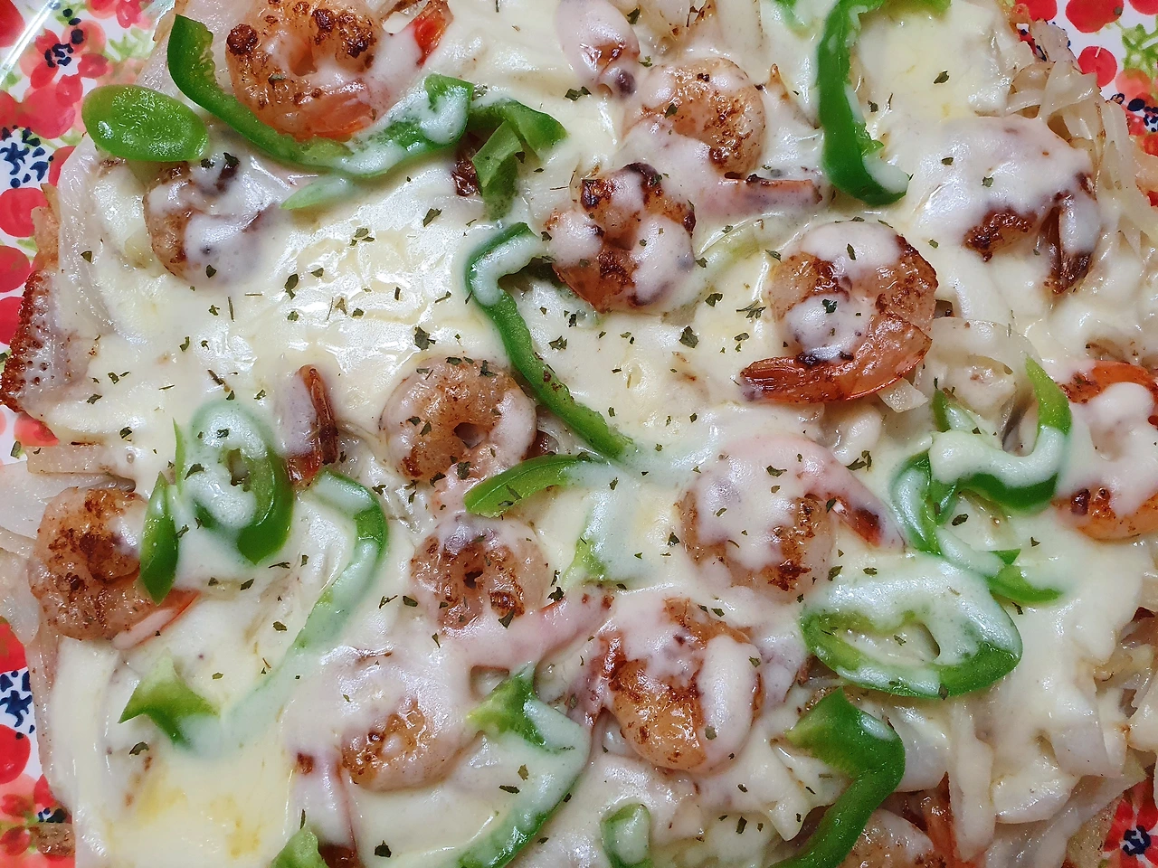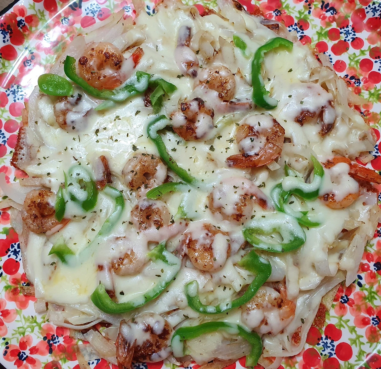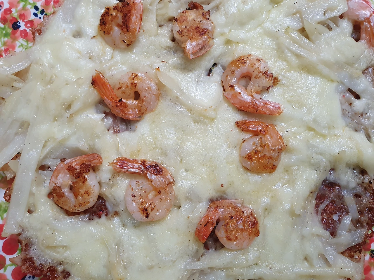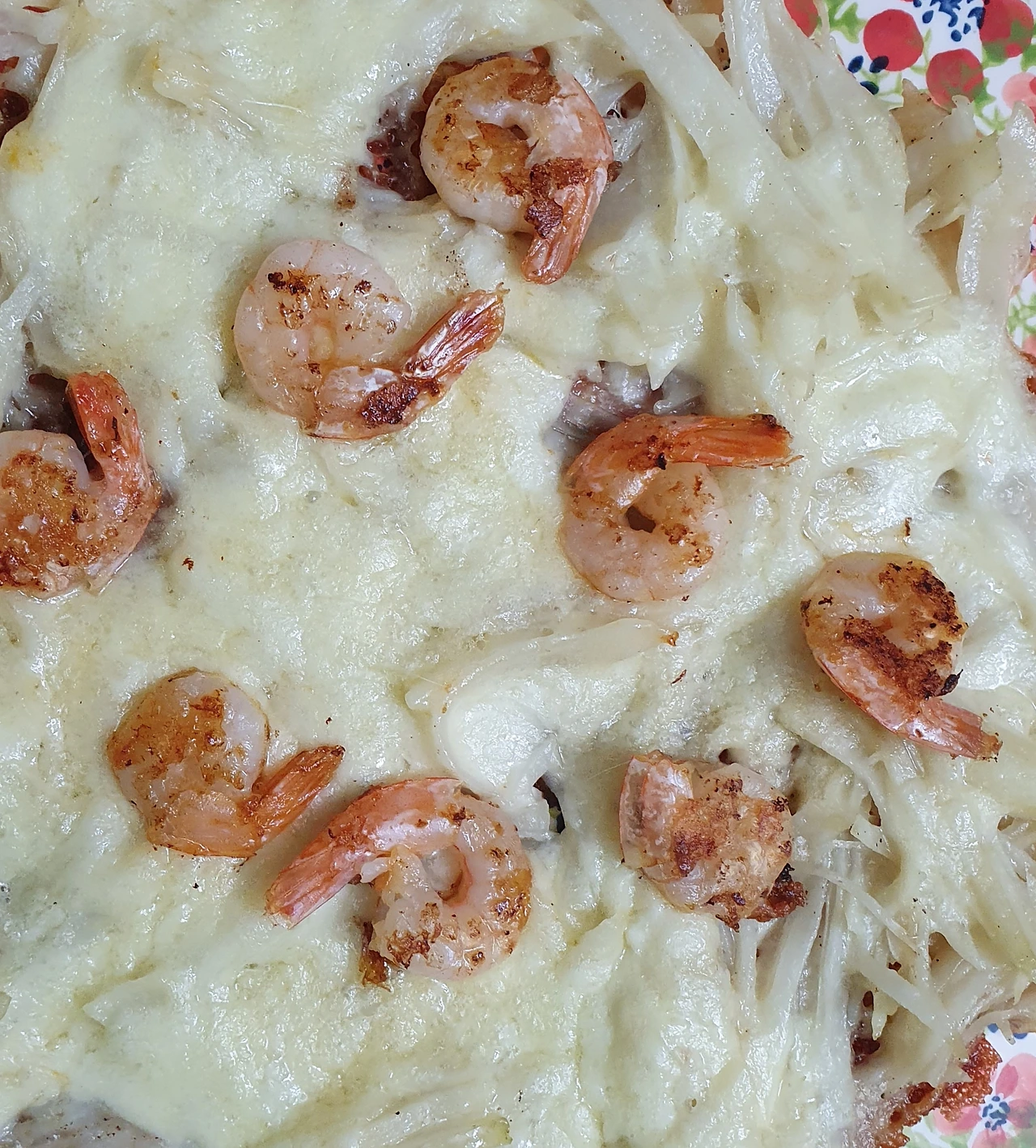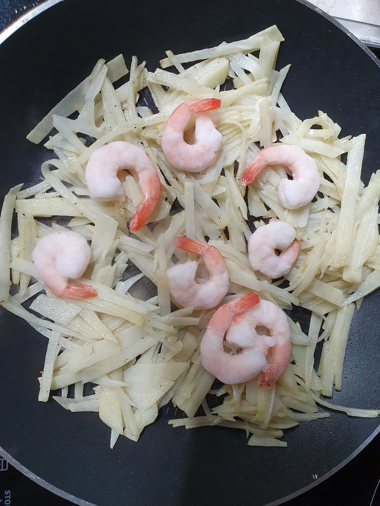 ♡ 볶은 감자채를 잘 펴서 둥근 모양을 만든 후 새우를 볶아 위에 얹었다.
