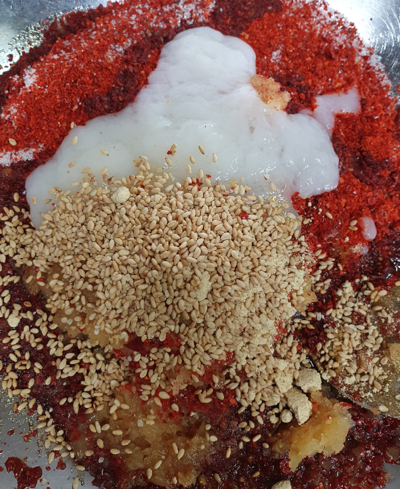고추가루(2 종이컵)에 매실(2 소주잔)+설탕(2T)+풀(2T)+마늘(2T)+생강(1/2T)+통깨를 추가하여 완성했다.