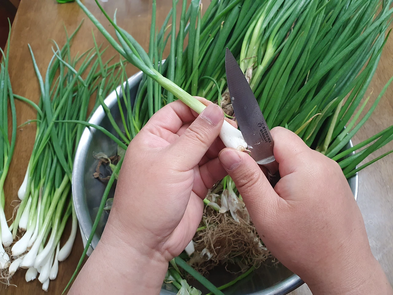 지난번 ‘오이소박이’ 김치도 대성공을 거둔 터라 자신감 뿜뿜으로 ‘파김치 먹을 사람~~~!’을 외치니 가족들이 모두 손을 들었다. 그럼, 그렇지. 그렇다면 파는 누가 다듬을까? (쪽파나 부추, 달래 다듬기가 얼마나 귀찮은 일인지 해 본 사람들은 안다. 특히 나는 엄청 더 싫어하는 일이기에) '파김치'를 먹고픈 순진한 가족들은 나의 큰 그림에 모두 동원되어 남편과 둘째가 나서서 쪽파를 다듬고, 막내가 흐르는 물에 깨끗이 씻으며 각각의 몫을 해냈다.ㅎ ㅎ 이제 나는 양념을 만들어 버무리기만 하면 맛있는 '파김치'가 뚝딱 완성되는 것이다.