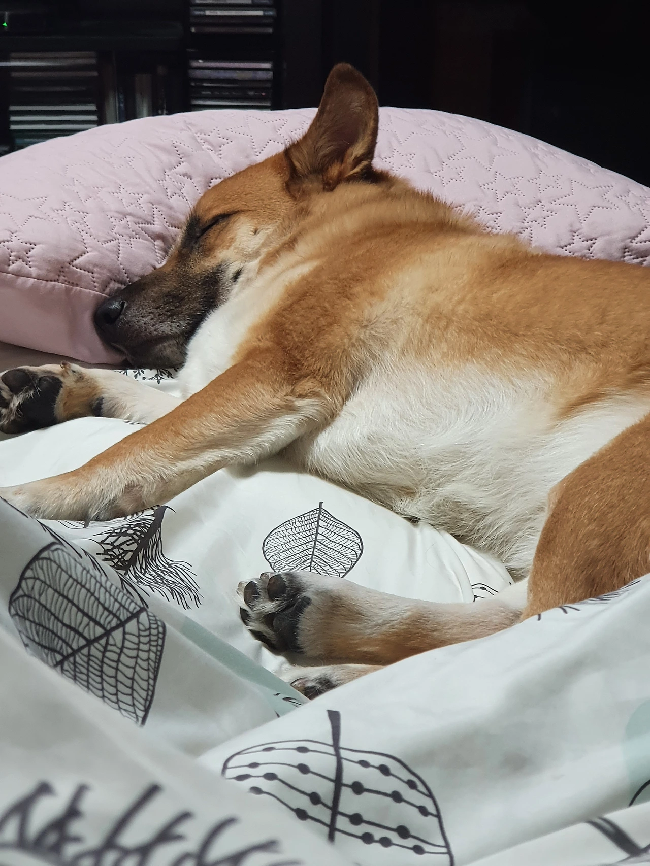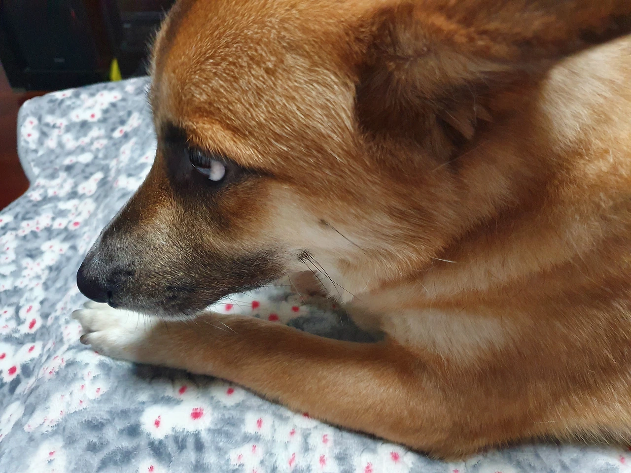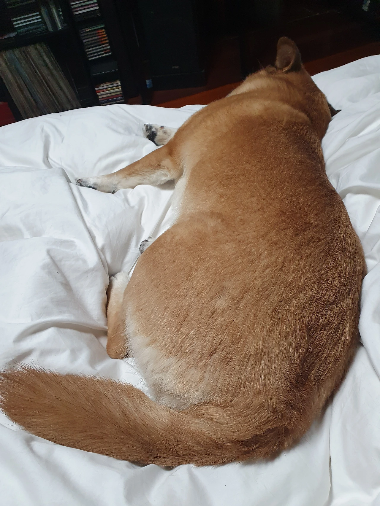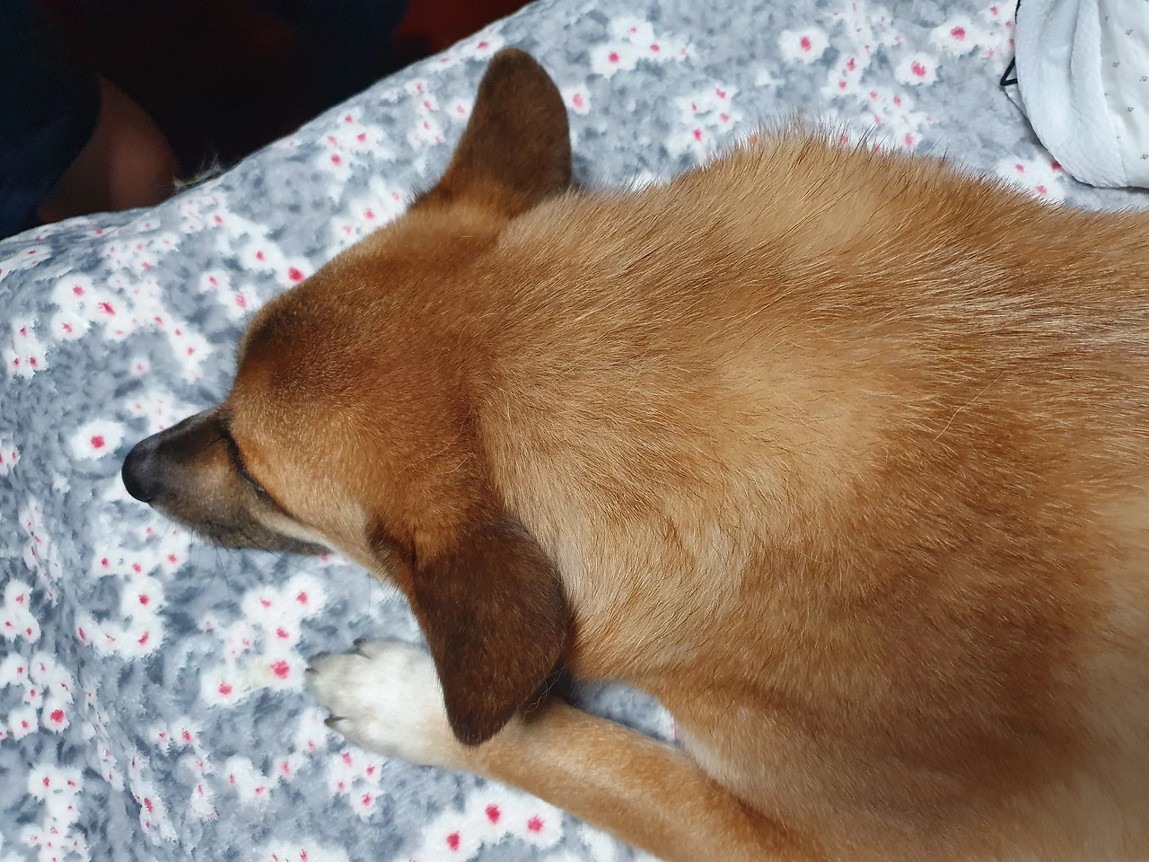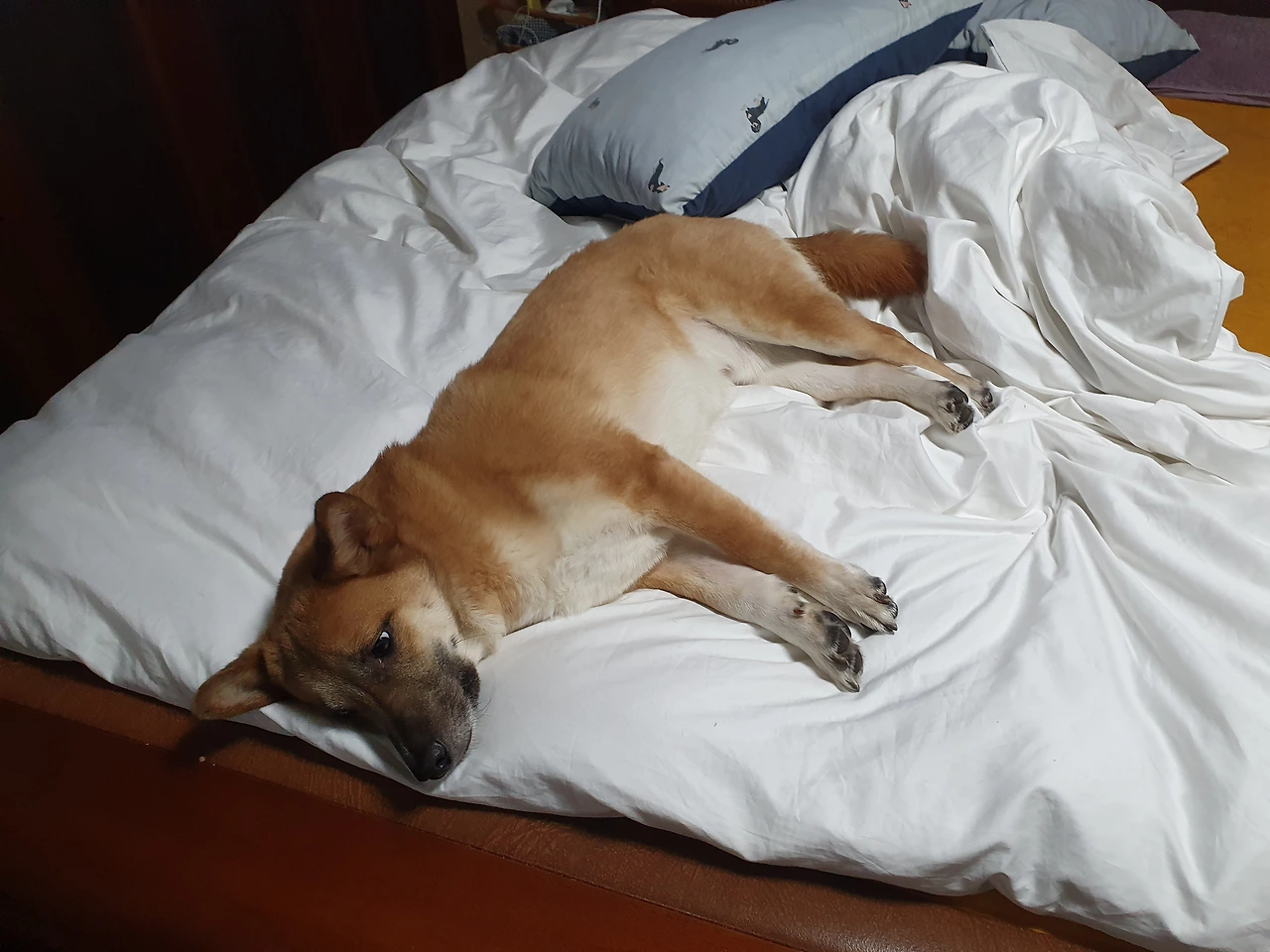 ◇ 발밑에 웅크린 강아지 ‘잡채’를 피해 남편과 나는 서로 팔자(八) 모양으로 벌어져 자야 한다.