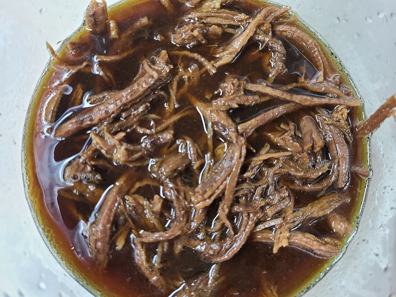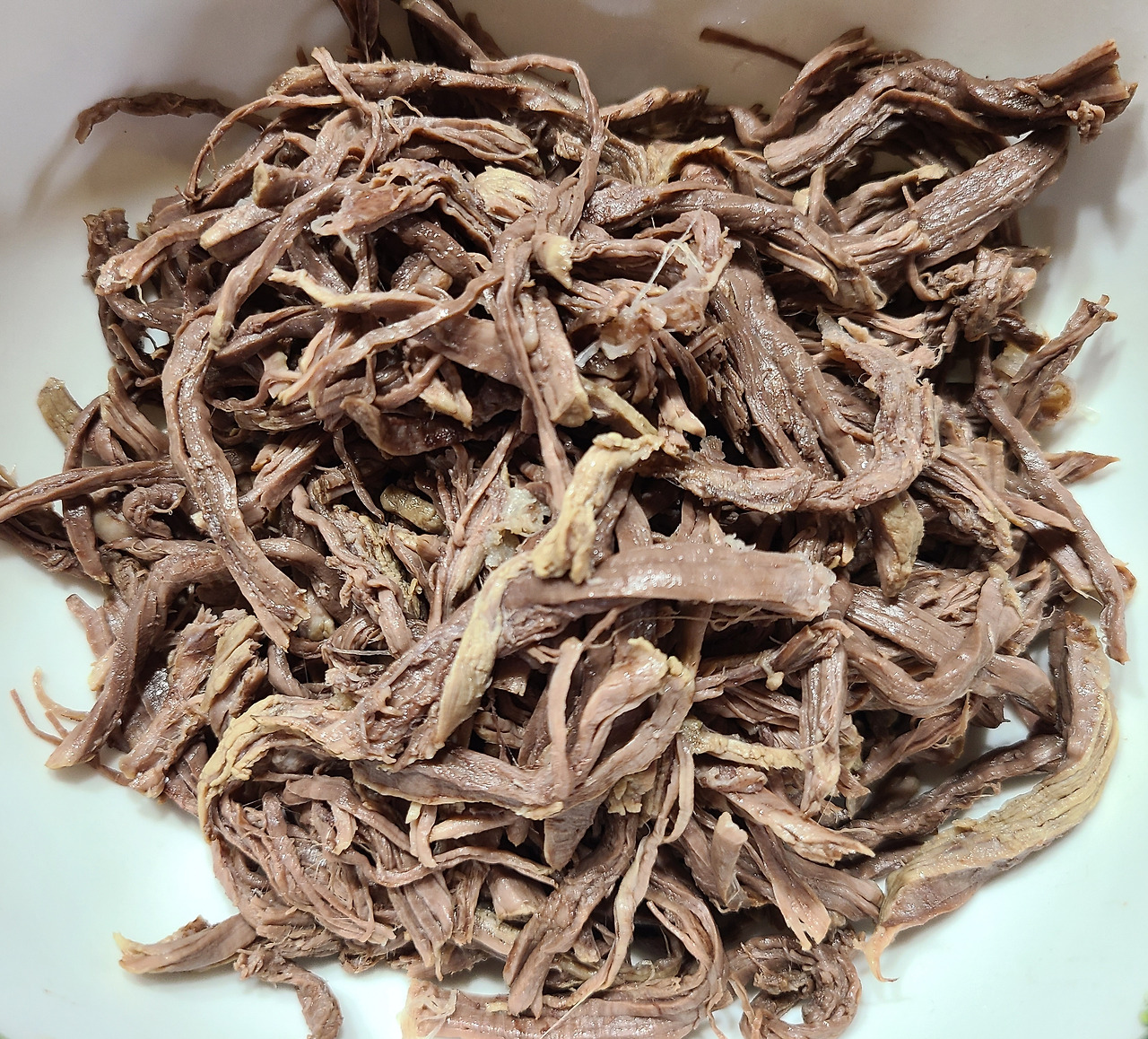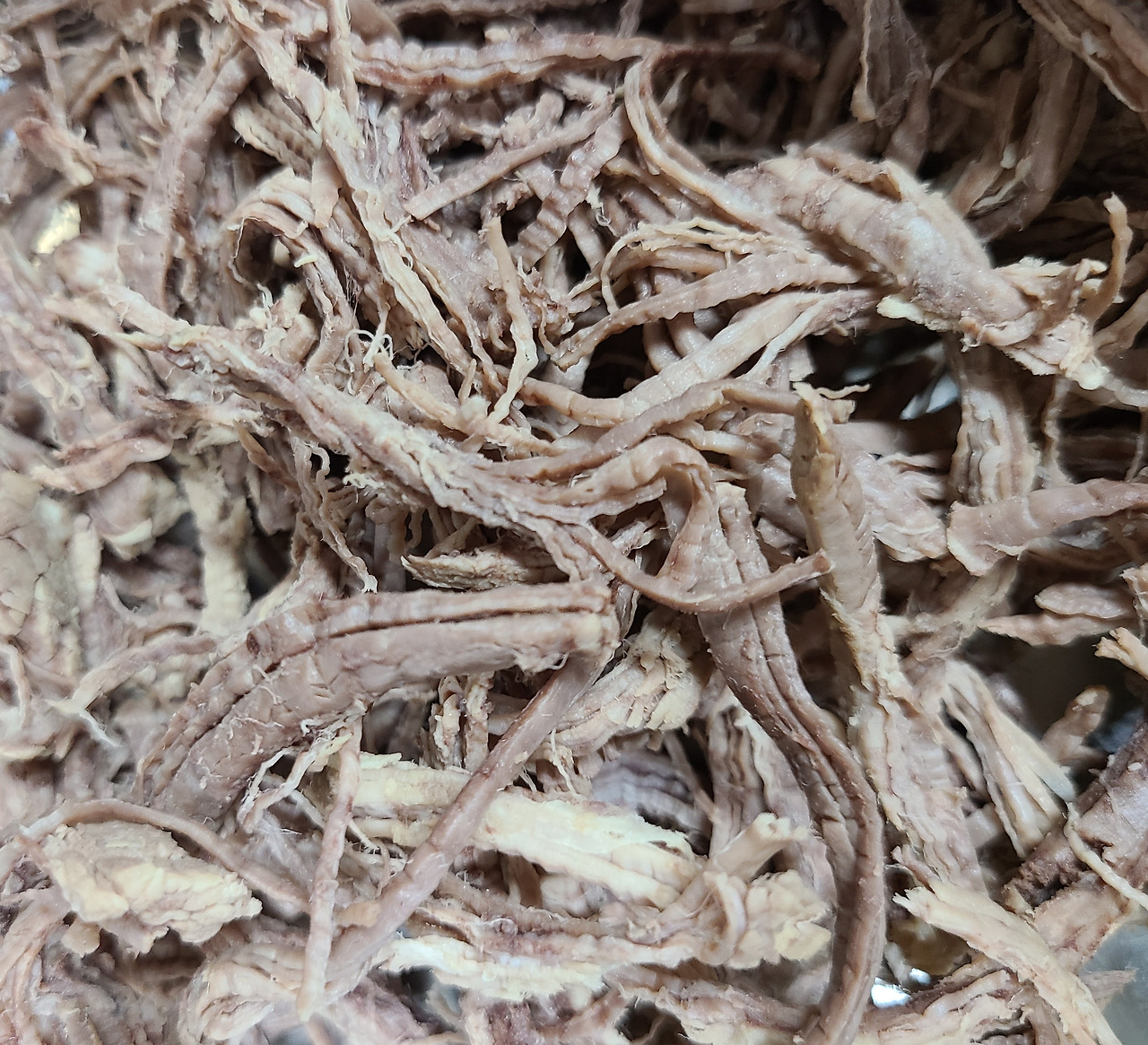 좀 더 곱게 찢으면 더 부드럽고 맛나다. 가위질보다 손질한 고깃결이 훨씬 맛있다.