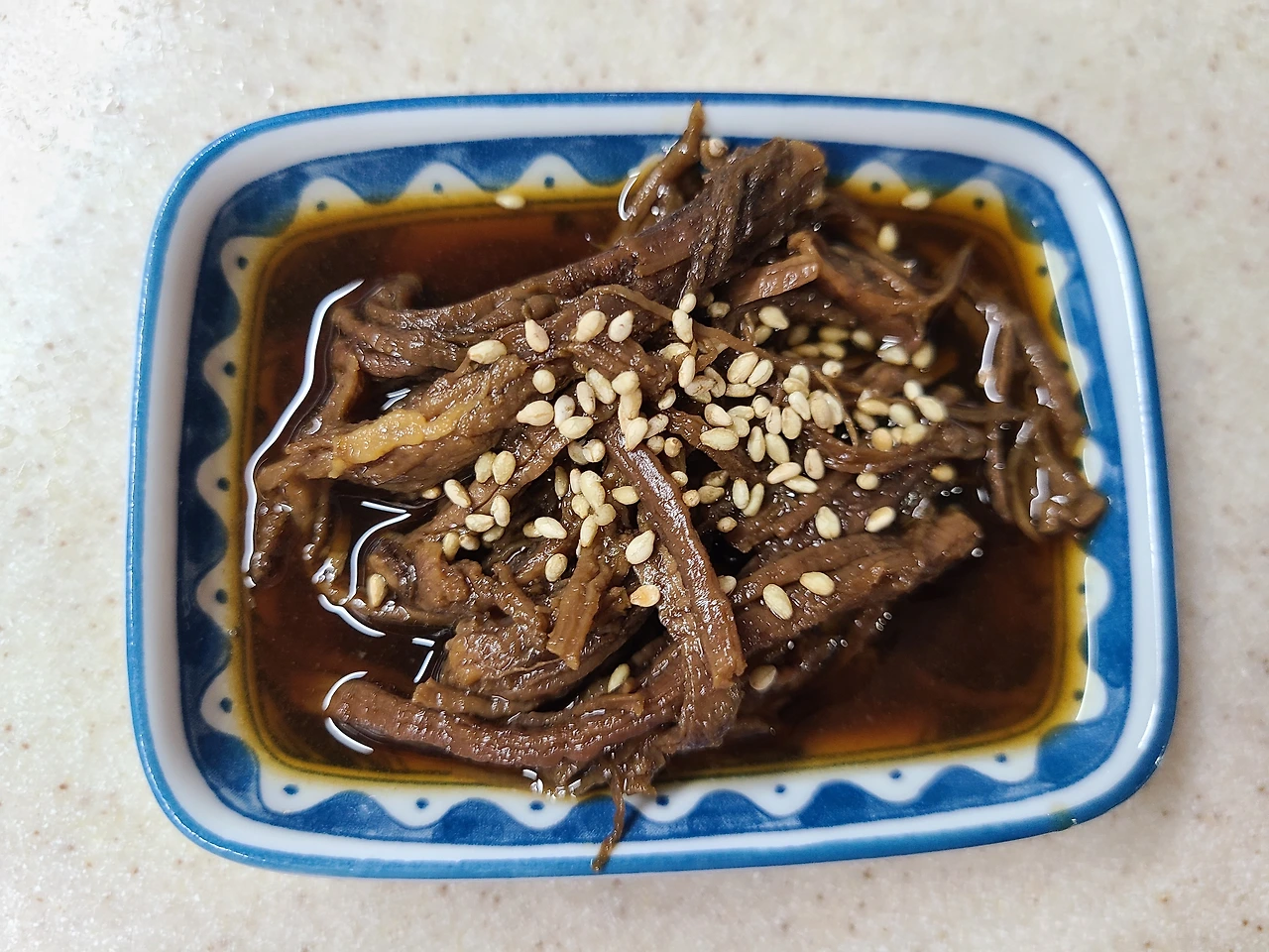삶은 고기 덩어리를 결대로 찢기가 힘이 들지만 레시피대로 리를 시작만 하면 정말 맛있는 장조림을 만들 수 있다. 아이들 손이 자주 가는 반찬 하나 후딱 완성했더니 기분이 금세 좋아진다. 질리지 않는 건강한 맛에 가격과 양도 훌륭하니 지난번 비싼 B죽 배달비가 상쇄되는 기분이다. 뚱한 곳에서 배달 음식비를 벌충하려는 나의 이상 심리도 편두통의 후유증은 아닌지 모르겠다. 짭조름하며 달짝지근한 밥도둑, 소고기 장조림 완성이다.