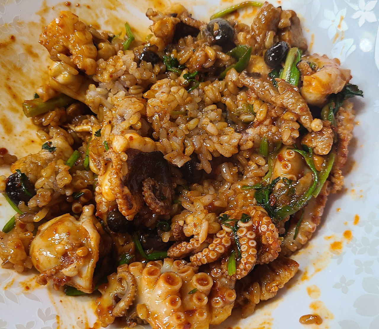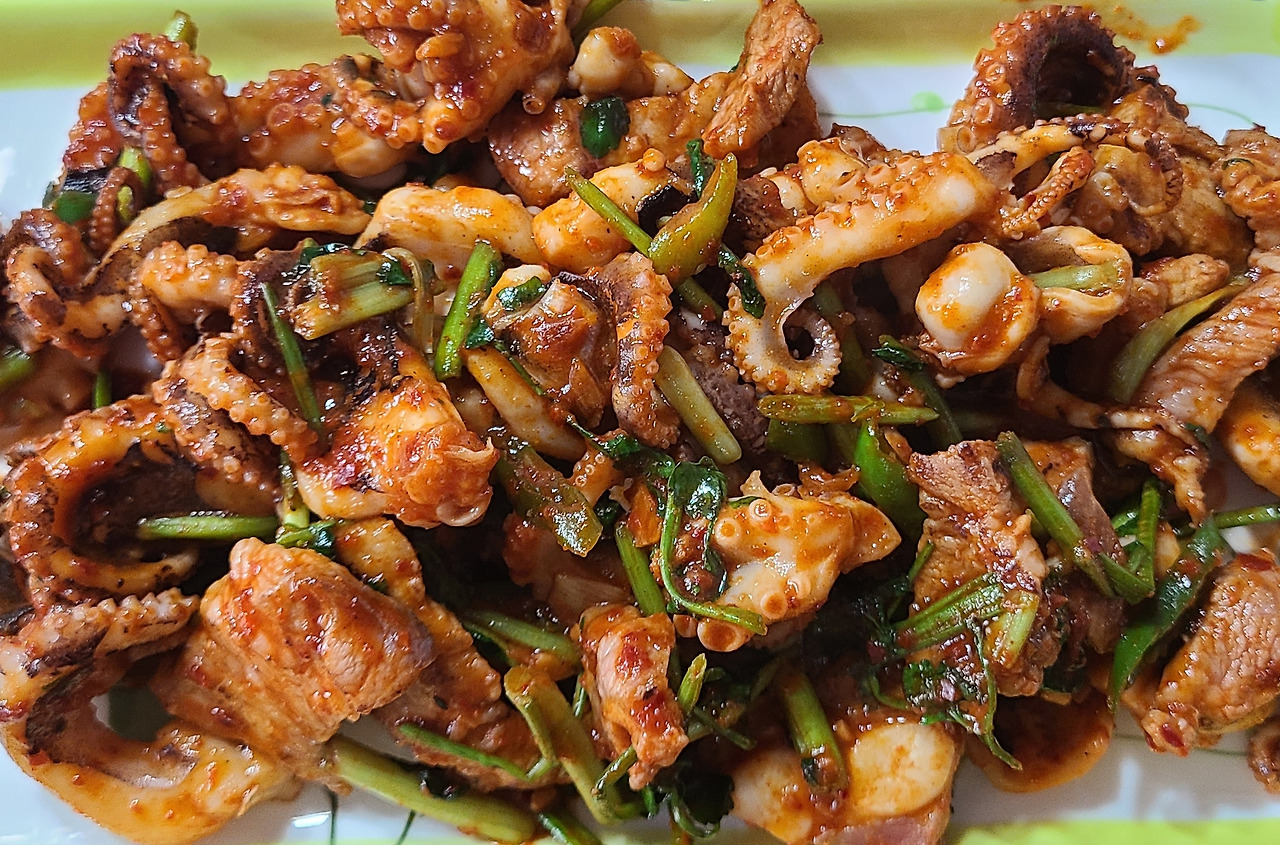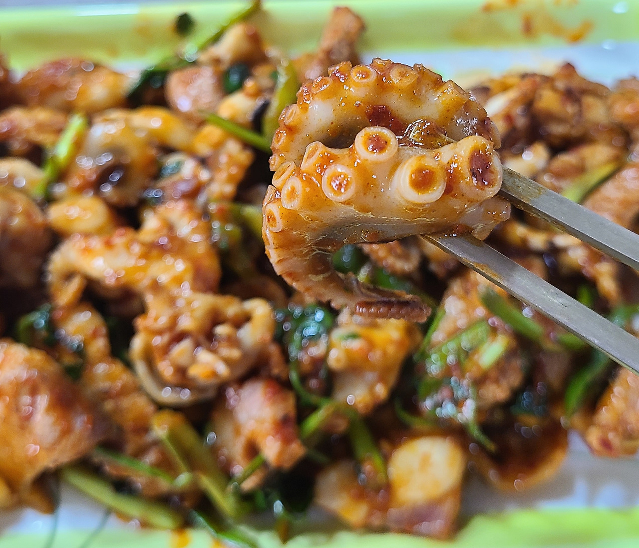 ♡ 달궈진 팬에 재워 놓은 삼겹살을 먼저 익힌 후 양념한 주꾸미를 넣어 채소와 빠르게 볶아낸다.