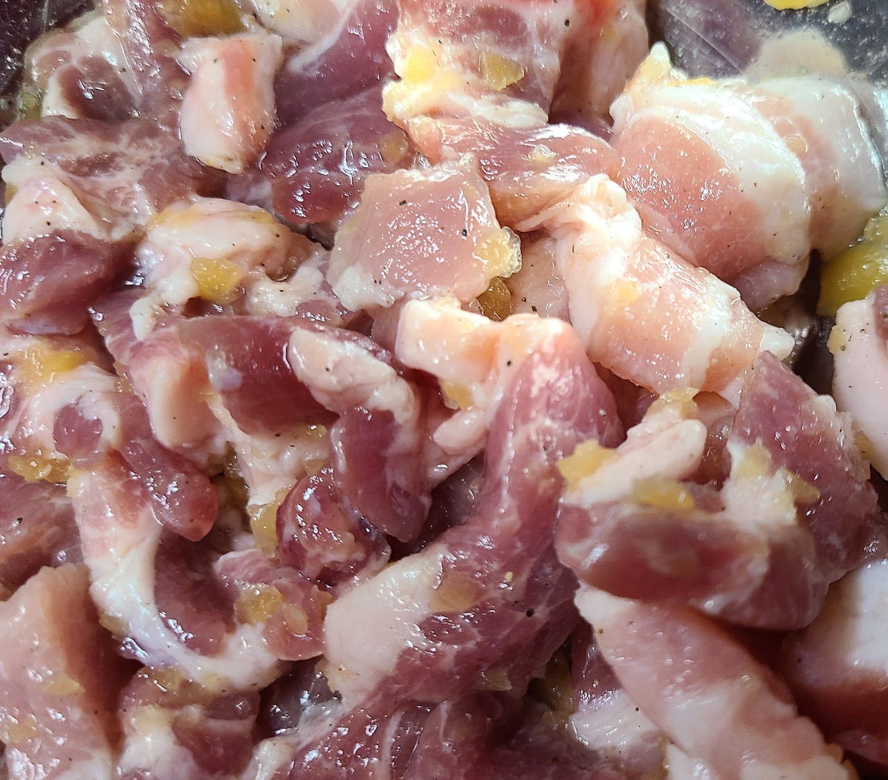 ♡ 냉장고에 있던 삼겹살 200g도 잘게 잘라 청주와 마늘에 재워 놓았다.