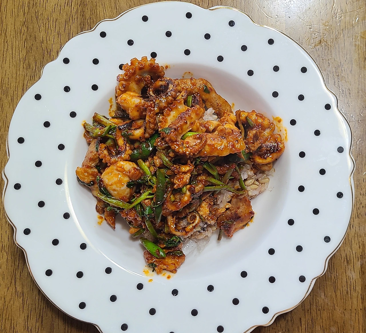 ♡ 데친 주꾸미를 알맞게 썰어 양념(고추장 1 +고춧가루 4+ 생강 + 마늘+ 설탕 2+ 참기름)에 버무려 놓는다. 데친 주꾸미 자체가 짜서 간장은 넣지 않았다.