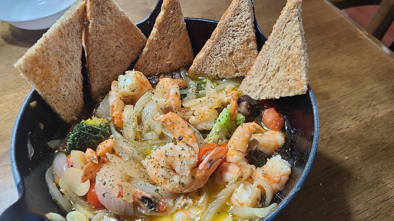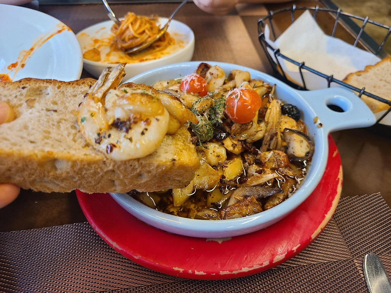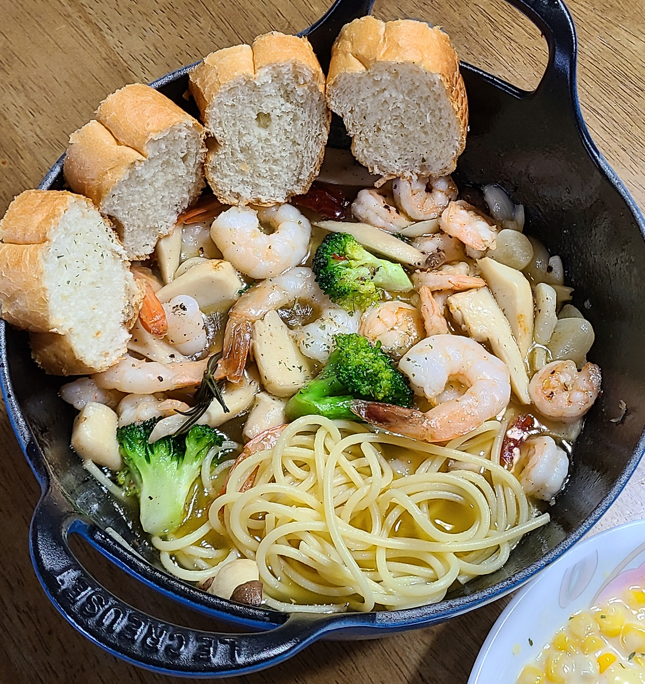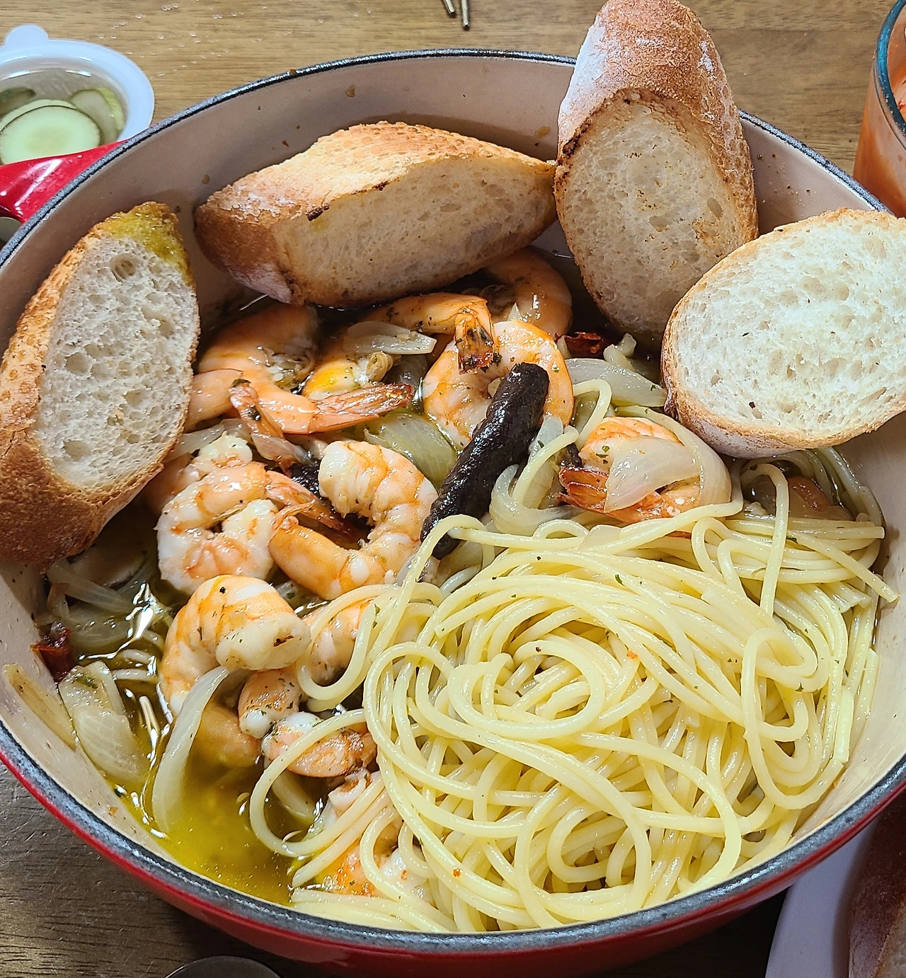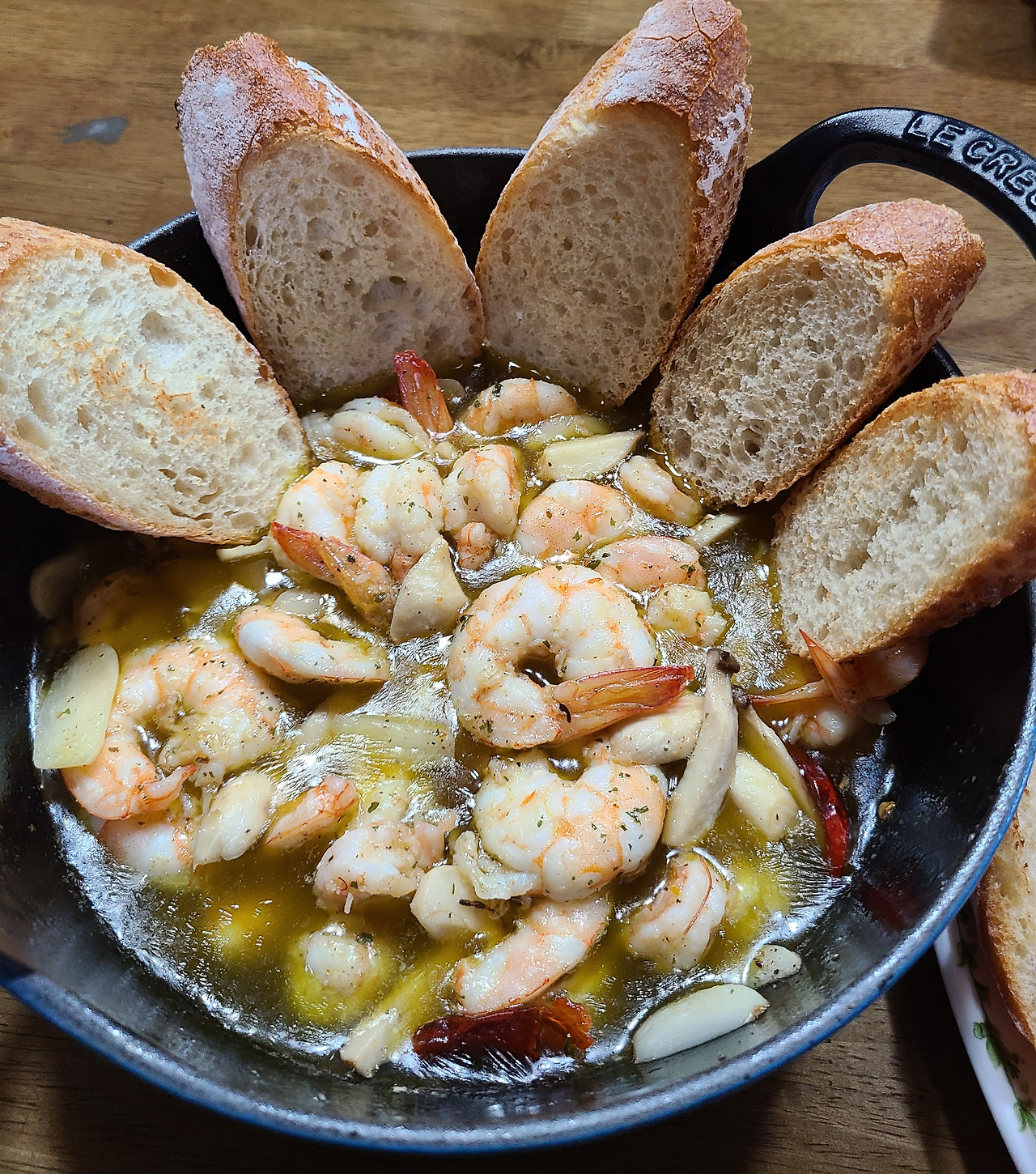♡ 기름기가 거의 없는 담백한 바게트는 풍미가 강한 감바스 알 아히요와 잘 어울린다. 바게트는 올리브유에 찍거나 새우 등을 얹어 먹는다.