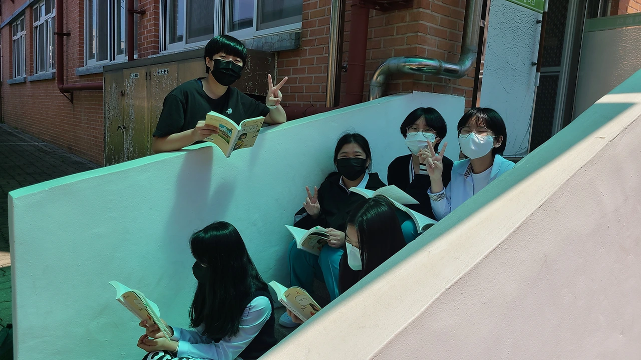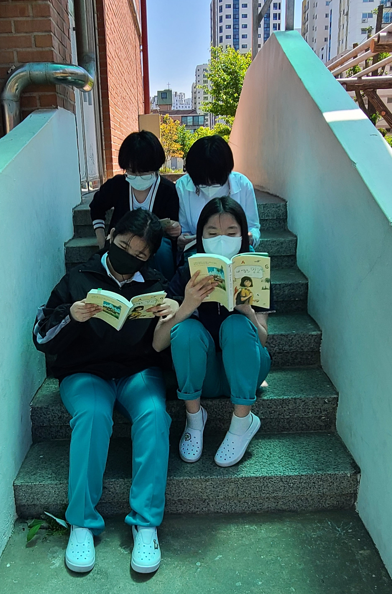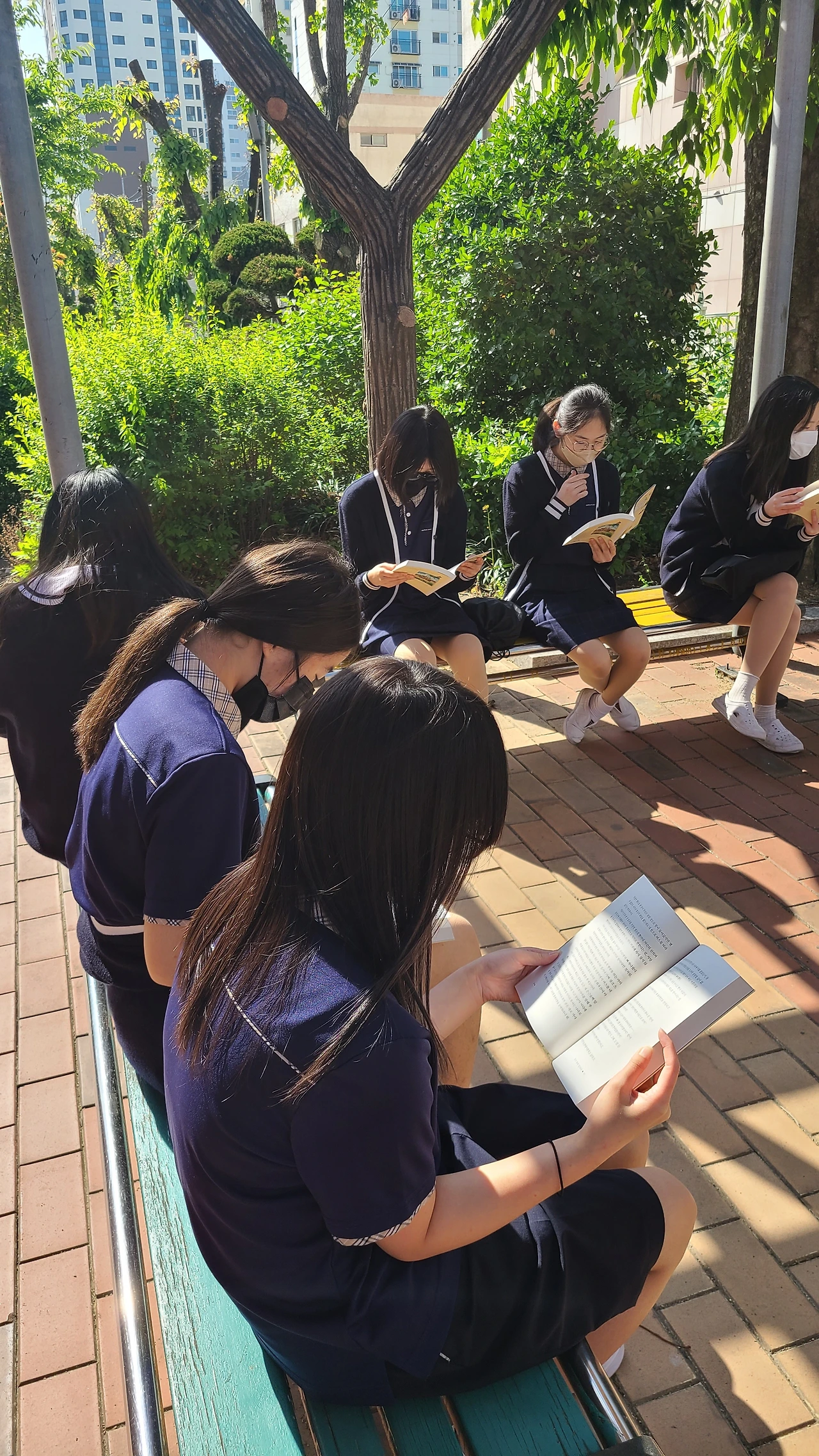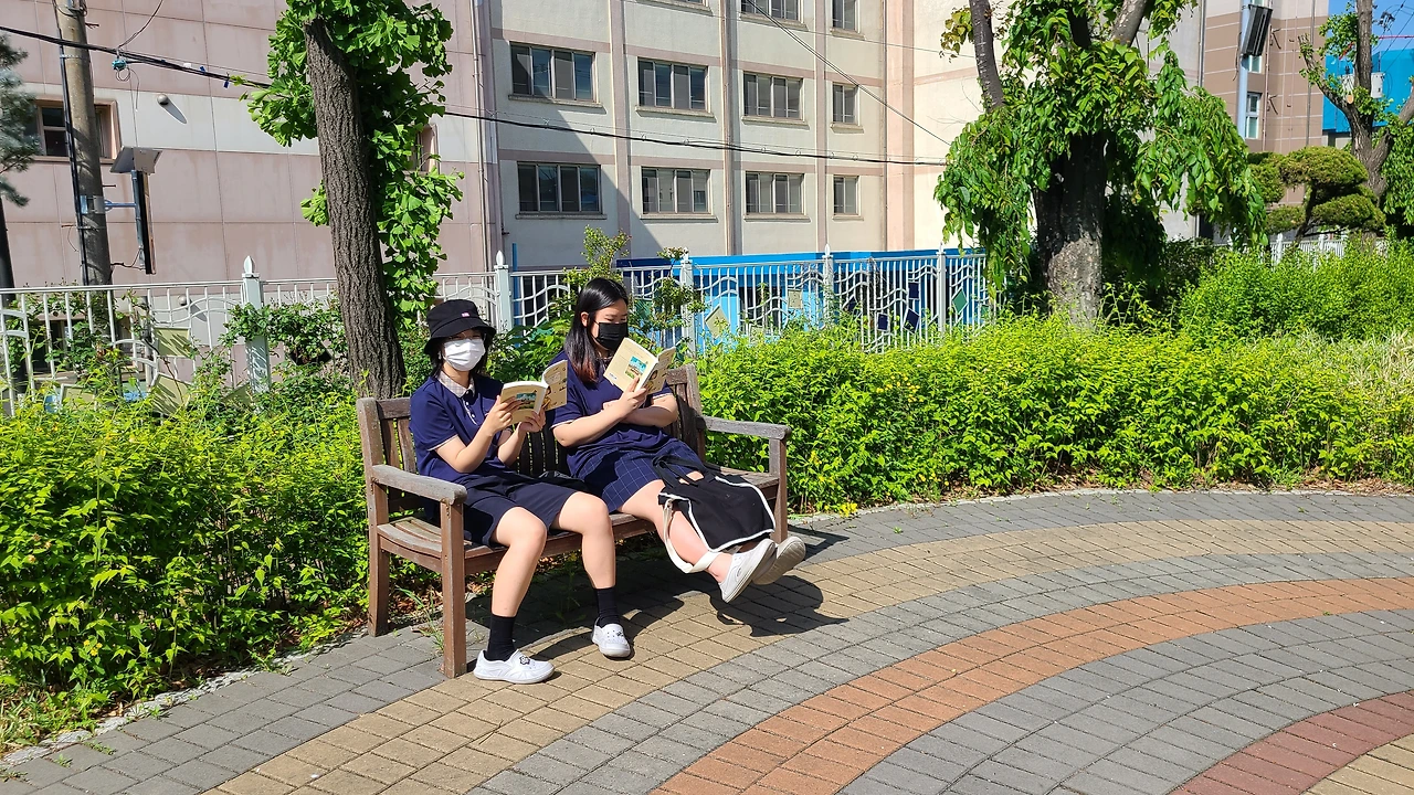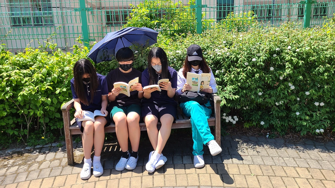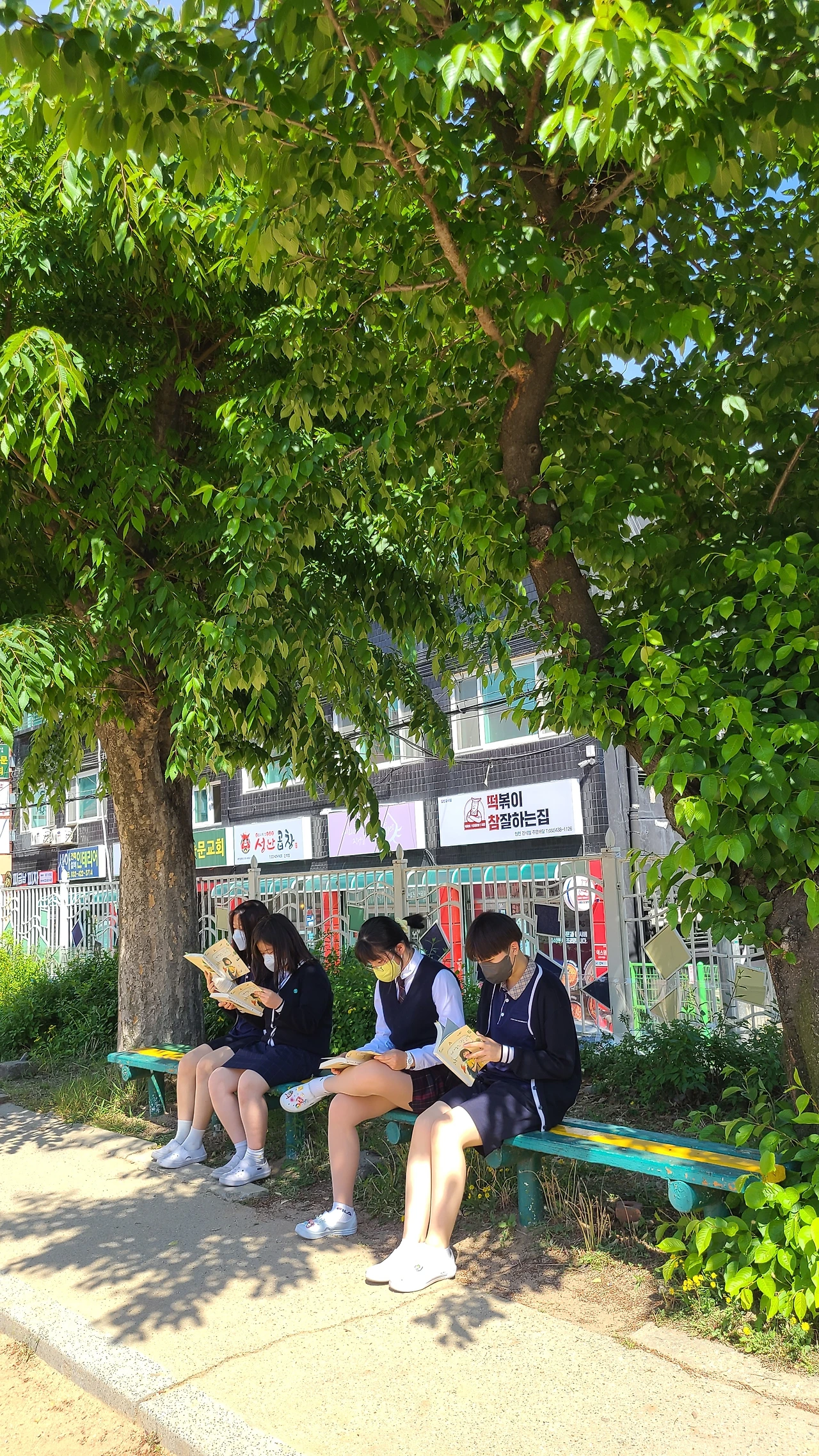 눈부신 햇살이 가득한 5월! 1회 고사도 막 끝났겠다. 책 읽기 딱 좋은 때다....라고 말했다. 게다가 우리 학교는 아름다운 숲으로 조성된 교정도 있지 않은가! 녹음이 우거진 그늘 아래, 시원한 바람을 느끼며 책을 읽는 맛이라니... 이 즐거움을 아이들과 공유하고 싶었다. 다행히 아이들은 교실 밖으로 나간다는 사실만으로도 환호성을 질렀다.