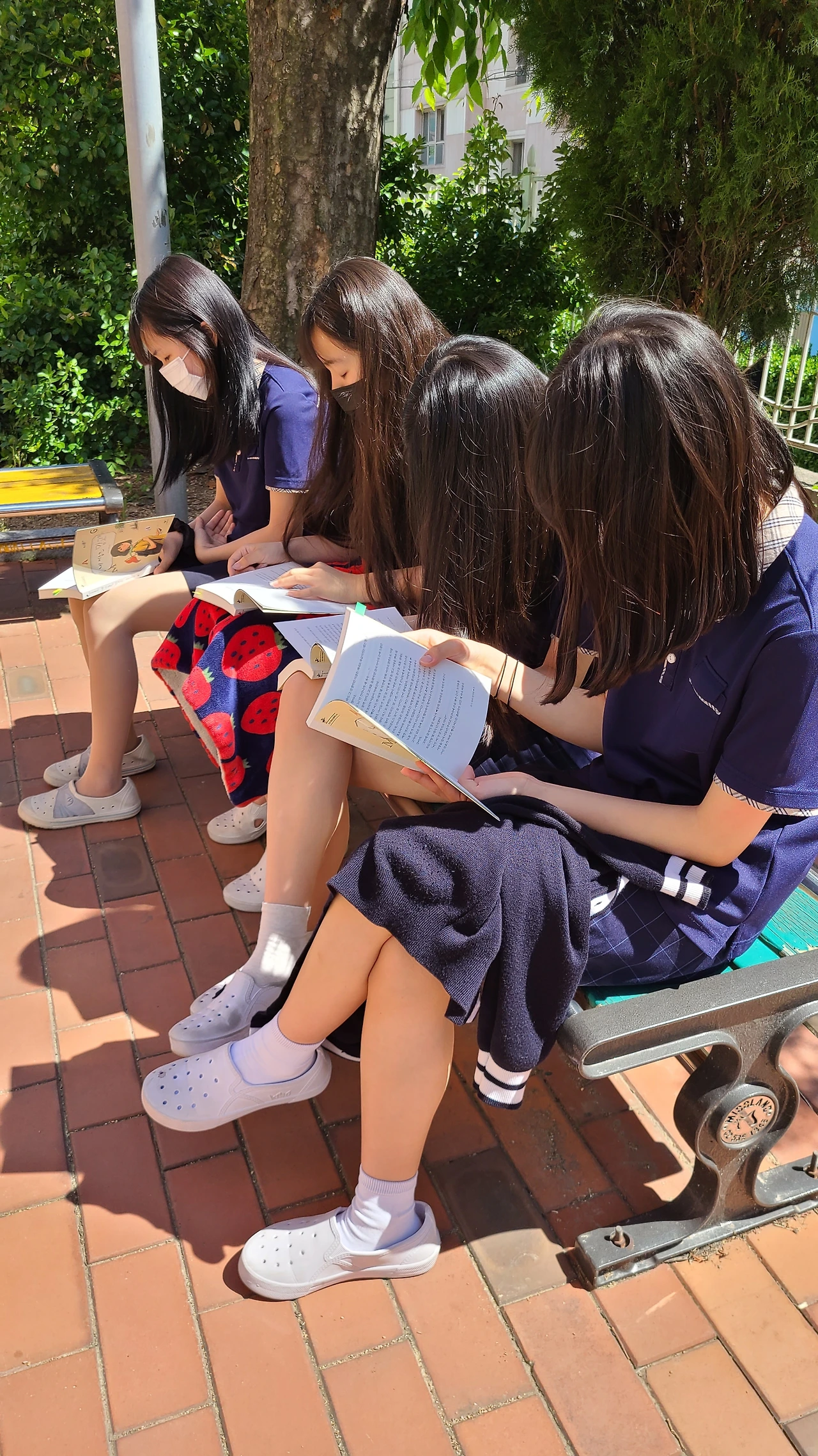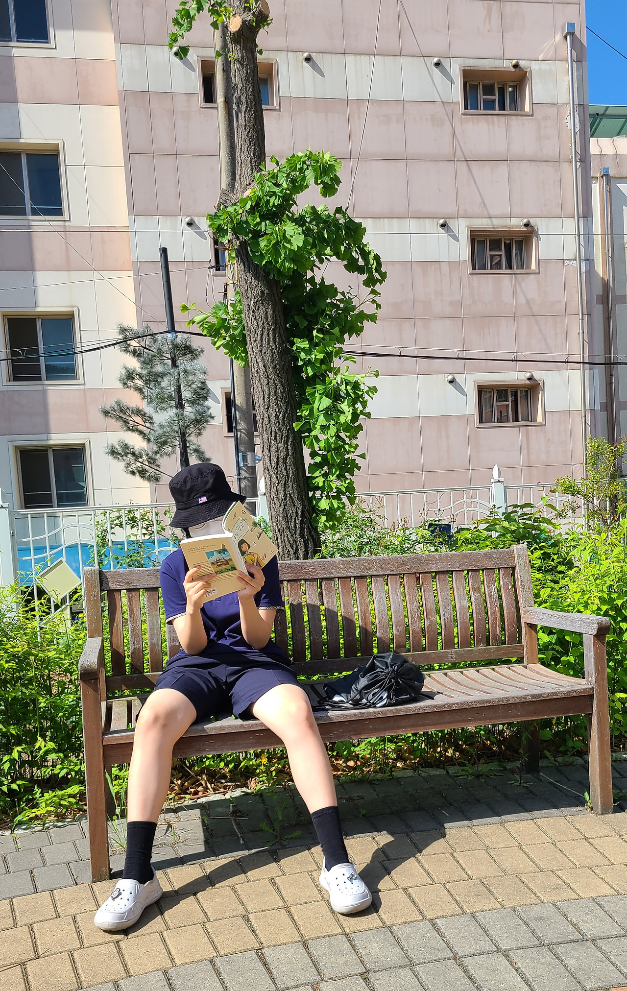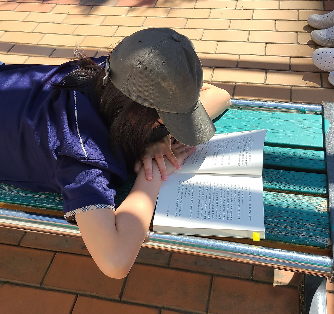 ♡ 아이들은 각자 책을 들고 교정으로 나갔다. ♡ 생각보다 벤치나 그늘이 없어 읽기가 쉽지 않았다. ♡ 아이들은 눈에 보이지도 않는 작은 벌레에 호들갑을 떨며 소리를 질렀다. ♡ 한낮의 볕이 강해 직사광선의 위력을 실감했다. ♡ 사전 안내한 대로 모자나 우산을 준비한 아이들도 있다. ♡ 삼삼오오 책 읽는 모습이 기특하고 예뻤다. ♡ 최소한 하품하는 아이가 없다는 것만으로도 위안을 삼는다.