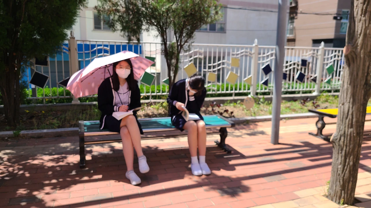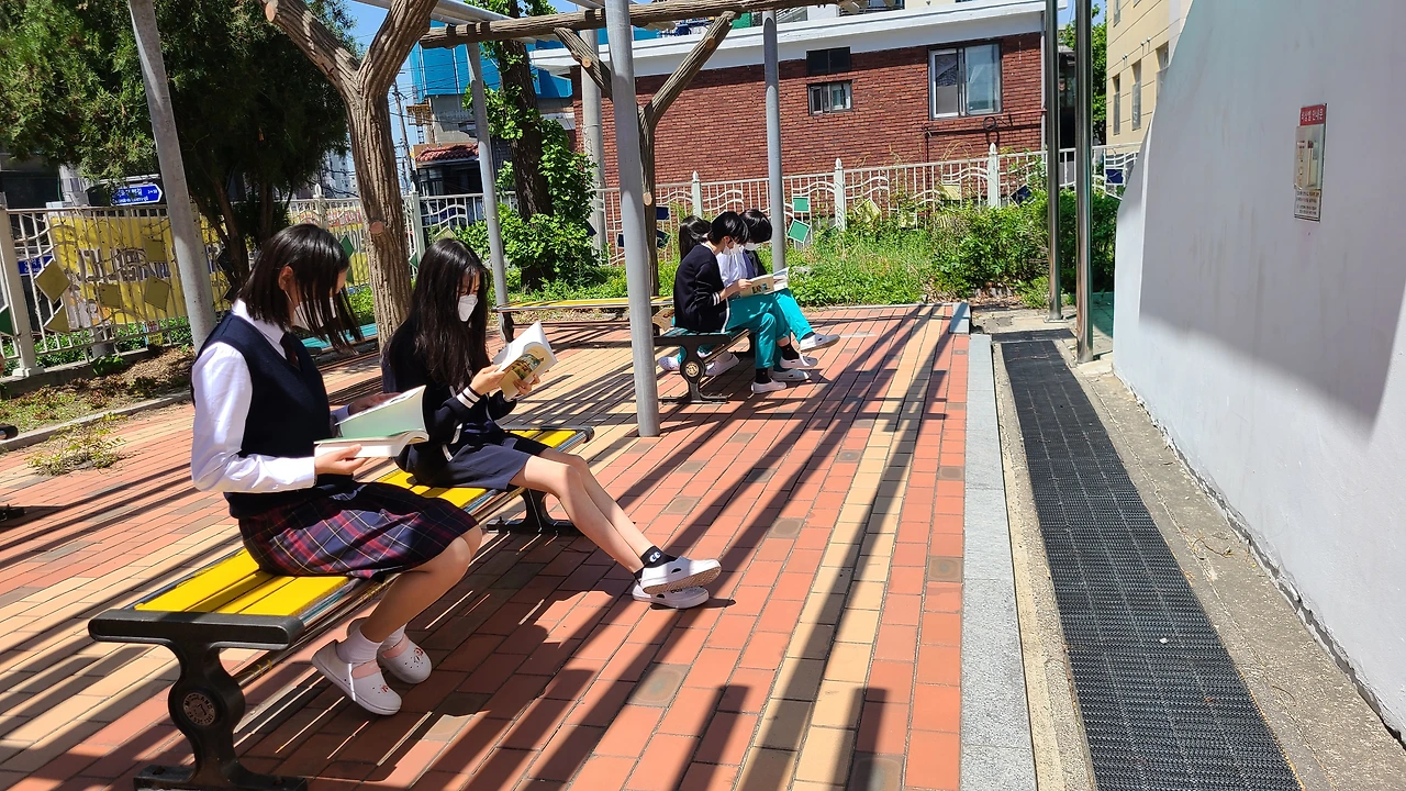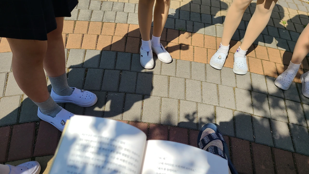 ♡ 아이들은 각자 책을 들고 교정으로 나갔다. ♡ 생각보다 벤치나 그늘이 없어 읽기가 쉽지 않았다. ♡ 아이들은 눈에 보이지도 않는 작은 벌레에 호들갑을 떨며 소리를 질렀다. ♡ 한낮의 볕이 강해 직사광선의 위력을 실감했다. ♡ 사전 안내한 대로 모자나 우산을 준비한 아이들도 있다. ♡ 삼삼오오 책 읽는 모습이 기특하고 예뻤다. ♡ 최소한 하품하는 아이가 없다는 것만으로도 위안을 삼는다.