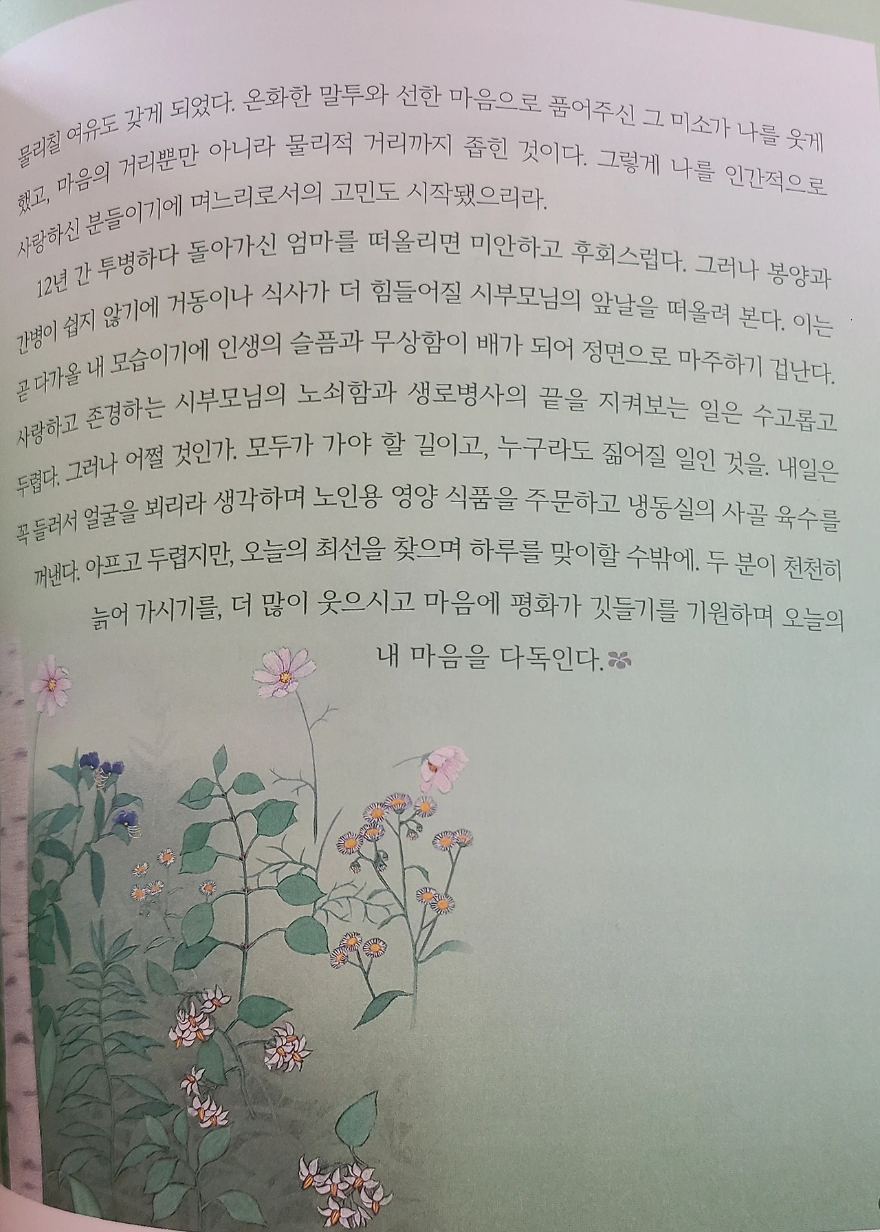 12년 간 투병으로 고생하다 돌아가신 엄마를 생각한다. 미안함과 후회가 크지만 봉양과 간병이 절대 쉽지 않음을 알기에, 앞으로 거동과 식사가 더 힘들어질 시부모님의 앞날을 떠올리기에 가엾고 짠한 마음이 가득하다. 그분들의 모습이 곧 다가올 나의 모습이며 그래서 인생의 슬픔과 무상함을 더 느끼기에 마주하기가 겁난다. 사랑하고 존경하는 시부모님의 노쇠함과 생로병사의 끝을 지켜보는 일이 수고롭고 두렵다.