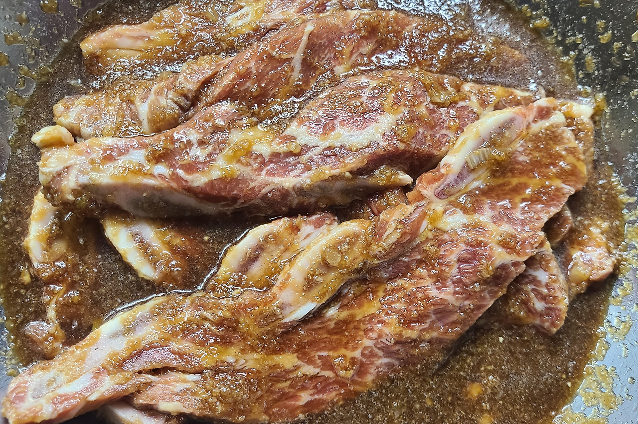 ♡ 핏물 뺀 갈비에 양념과 간 양파와 배를 넣고 버무려 냉장고에 하루 정도 숙성한 후 굽는다.