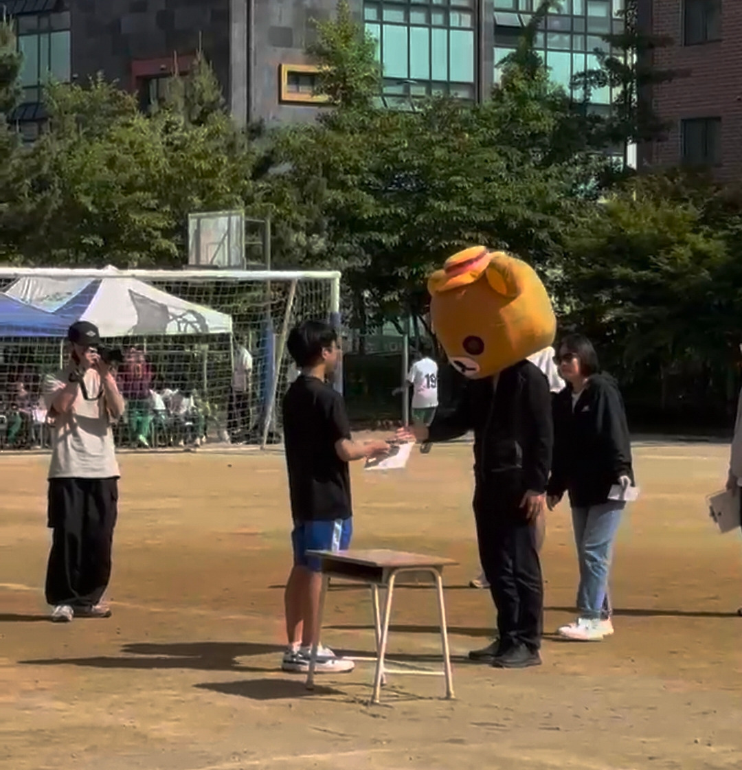 드디어 우리 반 아이들의 입장이다. 시작은 엉성한 듯 수줍음으로 출발했으나 가지가지 소품과 개성적인 복장으로 공연을 잘 마쳤다. 대담하게도 교장선생님까지 모셔와 통 큰 입장식의 큰 그림을 완성하였다. 교장선생님은 아이들을 위해서 기꺼이 무거운 곰돌이 가면을 쓰기도 하고, 칼라풀 염색 머리 착장을 마다하지 않으며 아이들과 함께 운동장을 빛내 주었다. 아이들과 교장선생님이 서로 통하는 정겹고 감사한 장면이었다.