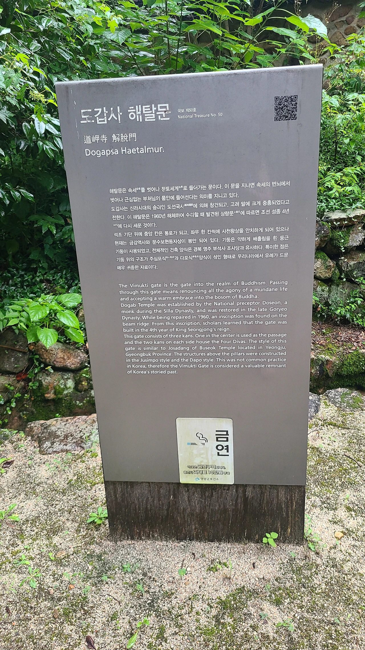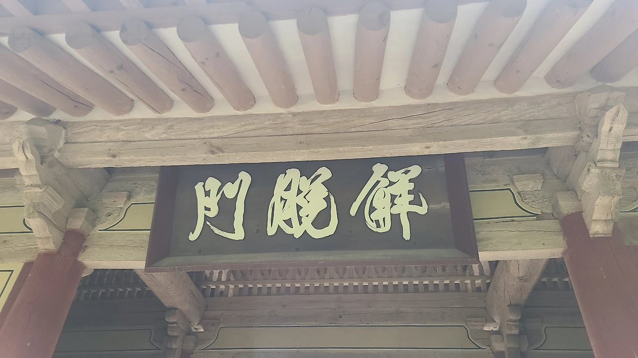 몇 번의 답사 기행으로 얻은 짧은 지식으로 해탈문의 앞면 3칸, 옆면 2칸, 주심포 양식(측면은 다포양식)을 확인해 본다. 맞배지붕인 해탈문은 국보 제50호로 기둥양식이 유일하다고 한다. 내부에는 코끼리와 사자를 타고 있는 동자상(보물 제1134호)인 보현동자상(실천을 상징)과 문수동자상(지혜를 상징)이 있는데, 모조품으로 진품은 성보박물관에 보관되어 있다고 한다.