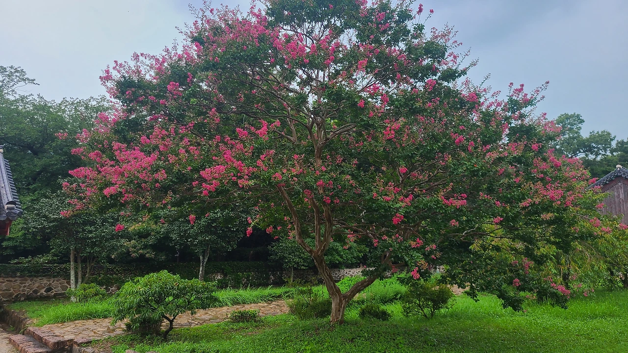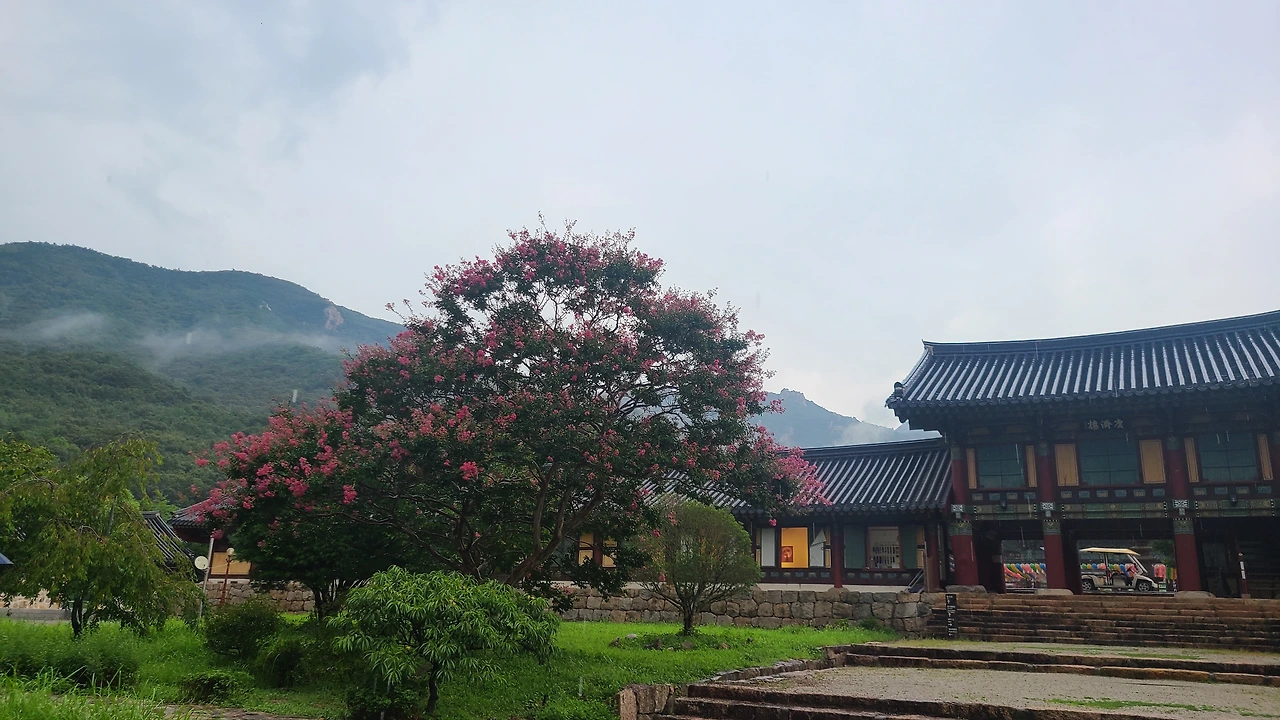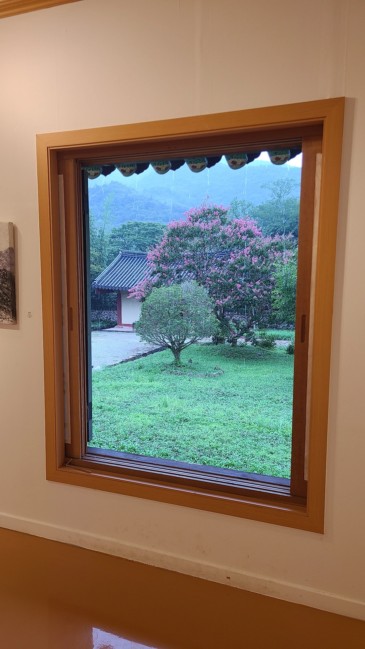 되돌아 해탈문을 향해 도갑사 쪽으로 올라오니 풍경이 아까와는 달리 보였다. 여름을 알리는 배롱나무가 비에 젖어 운치를 더하고 그 너머 광제루(두루 중생을 구제한다는 뜻-2층 누각)가 길게 이어졌는데 무엇보다 광제루에 자리 잡은 '월출산 갤러리'가 숨은 보석인 듯 인상적이었다. 월출산을 그린 그림들 사이로 갤러리 창을 통해 보는 바깥 풍경이 더할 나위 없이 아름답고 환상적이었다. 잠시 넋을 잃고 빗 속의 배롱나무의 액자적 풍경에 빠져드니 폭염 속이지만 정신이 맑아지고 가슴이 시원해졌다.