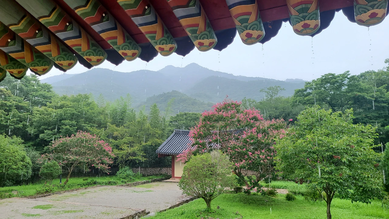 8월의 일요일 오후, 영암 도갑사는 한 폭의 그림처럼 고즈넉했다. 툇마루(광제루 회랑)에 앉아 여름비에 촉촉이 젖는 대웅보전 절마당을 바라보고 있자니 부러울 것도, 아쉬울 것도 먼지처럼 가벼워졌다. 처마에서 떨어지는 빗소리, 월출산을 배경으로 선 느티나무와 석탑, 절마당을 수놓은 연등과 풍경소리! 어느새 나를 다독이는 그림이 되어 내 마음을 가득 채우며 위로하는 듯했다. 소박하고 한적한 이 풍경은 오랜동안 나의 고단함과 피로를 사라지게 하리라.