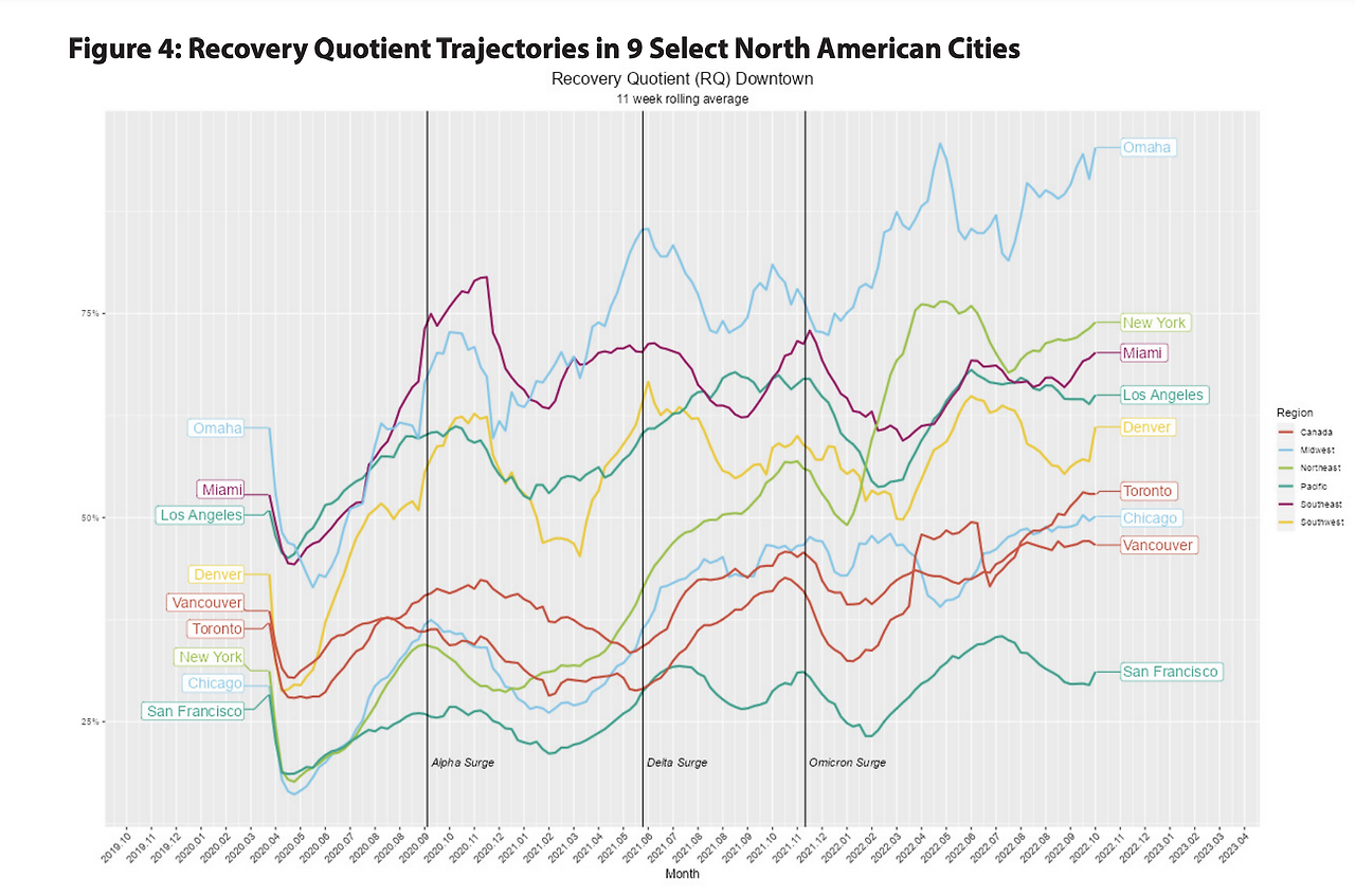트위터, 세일즈포스 등 거대 IT 기업 본사가 밀집해 한 때 미국 혁신의 중심지로 불렸던 샌프란시스코는 어쩌다 이렇게 됐을까? 늘 그렇듯 문제는 경제와 정치다. NYT는 코로나로 인한 경기 침체를 주요 원인으로 지목했다. 고임금을 받으며 생활하던 샌프란시스코 직장인들이 코로나와 재택근무로 지갑을 닫기 시작했다는 것이다. 심지어 일부는 출근할 필요가 없어지자 아예 비싼 이 도시를 떠나 다른 곳에서 일하기 시작했다. 이에 따라 이 지역 자영업자들이 하나 둘 무너지고, 상권이 죽고, 경제가 망가졌다는 거다. 벼랑에 몰린 사람들이 노숙인이 되고, 마약에 손을 대기 시작하는 악순환이 시작됐다는 분석이 나온다. UC버클리의 정부학 연구소가 북미 9개 주요 도시 중심부의 통화량을 토대로 경제 회복 수준을 분석한 보고서를 보면, 샌프란시스코의 회복 속도가 가장 뒤처진 것으로 나타난다.